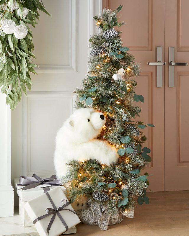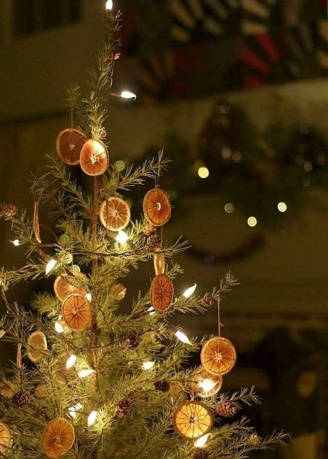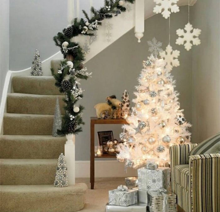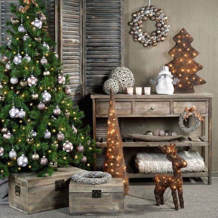 Стиль подразумевает акцент на естественной красоте деревца. Иногда на такой елочке вешают только одну гирлянду, а в некоторых случаях дополняют ее редкими шарами или ажурными бантами.