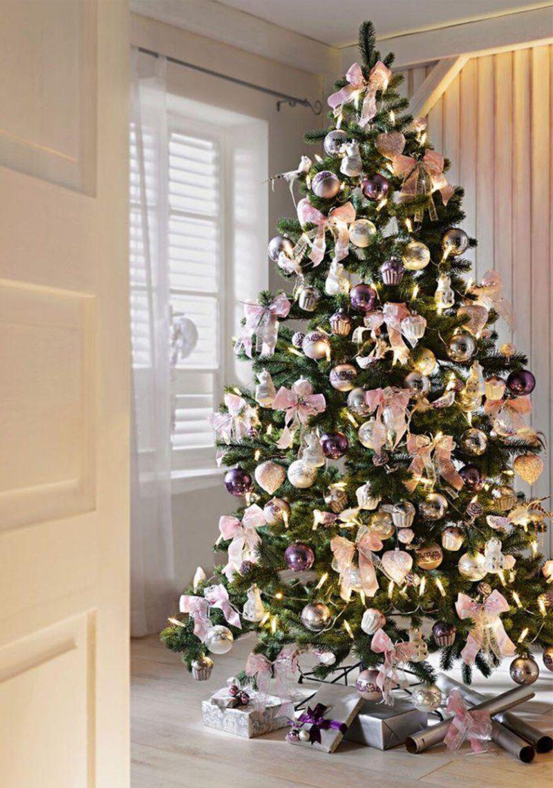 Романтичные и креативные натуры оформляются свою ель в розовой палитре. Для этого подойдет, как розовая искусственная елочка, так и натуральное деревце в розовом декоре. Также можно воспользоваться розовой мишурой, которая скроет природную зелень.