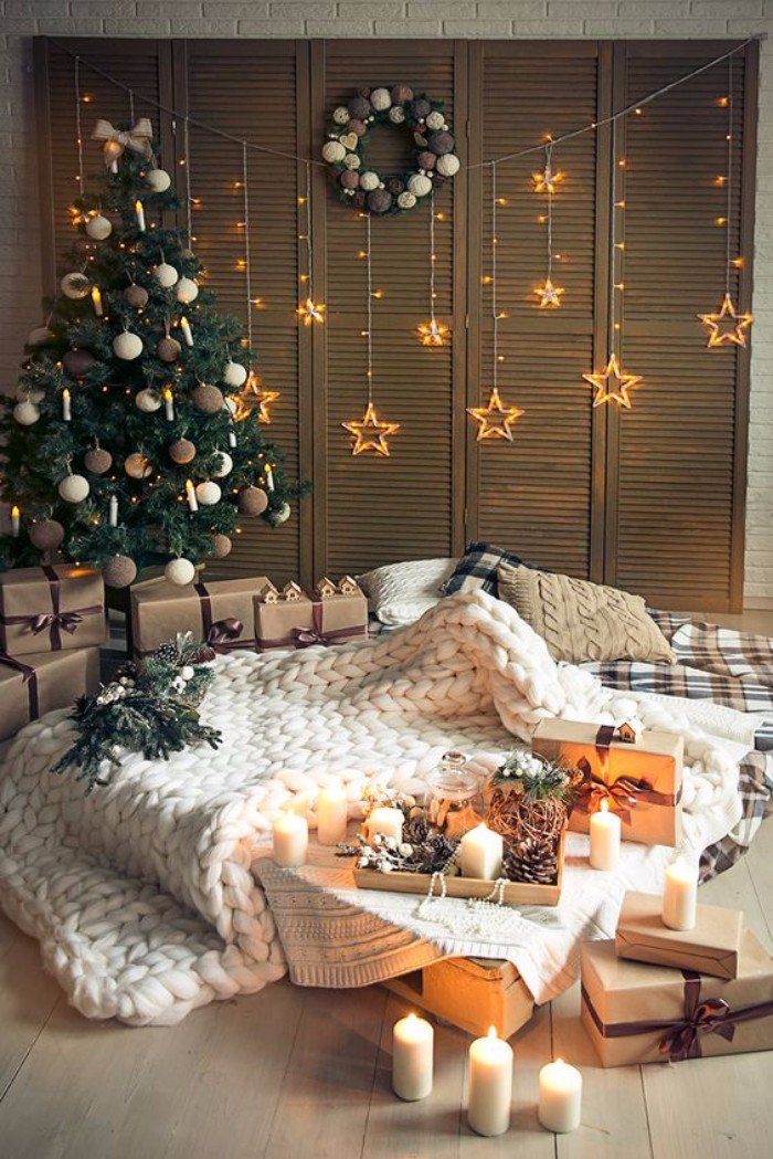В данном стиле используется монохромное сочетание синих цветов. А вот от излишнего блеска лучше отказаться. Стилю также присуще присутствие оленей и вязаного декора. Вязаными могут быть даже елочные шарики.