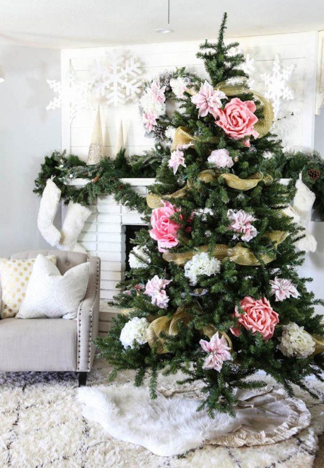 Украшение интерьера цветами является весьма популярным приемом дизайна в праздничные и повседневные будни. Елку, например, допустимо украсить посредством как живых, так и искусственных цветов.