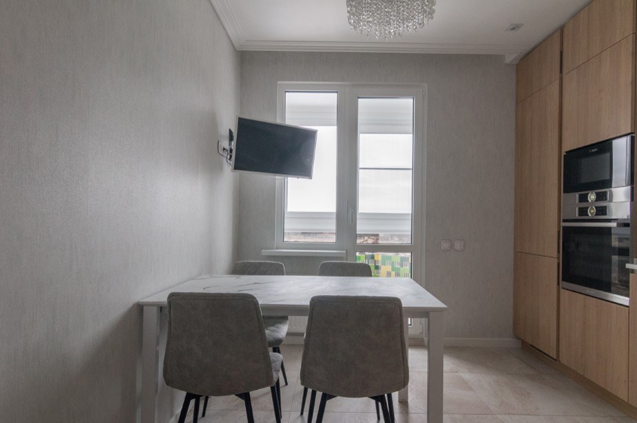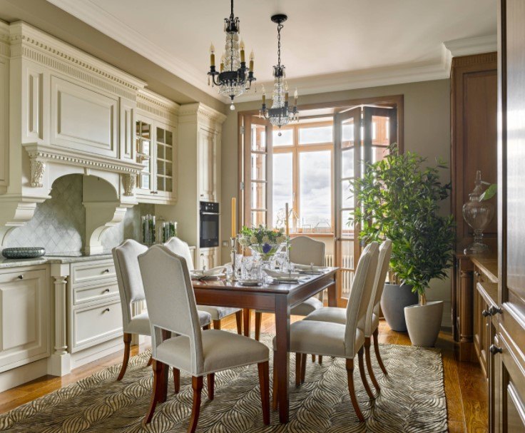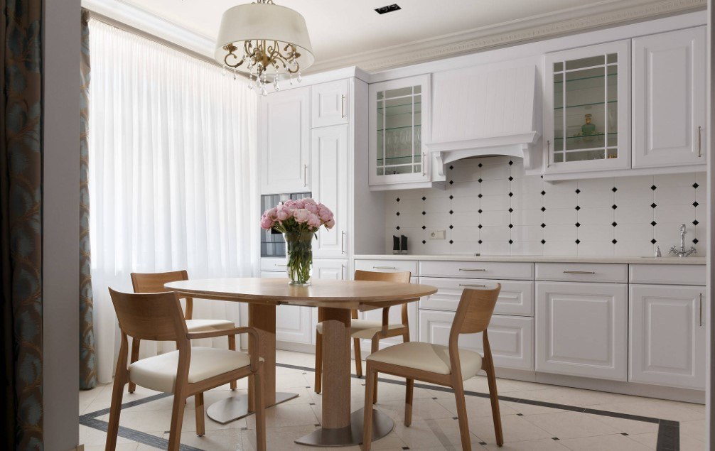 Аналогичное влияние оказывает и материал стола. Стеклянный воспринимается, как более легкий и воздушный, а натуральное дерево на маленькой кухне будет смотреться попросту неуместно. Тоже самое можно сказать и о стульях, используемых в комплекте со столом. Так или иначе, всегда удобнее приобретать готовый комплект столовой группы, где друг другу соответствуют все детали и дизайн в целом.