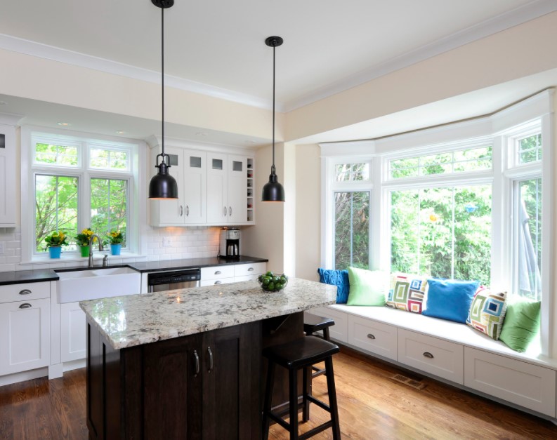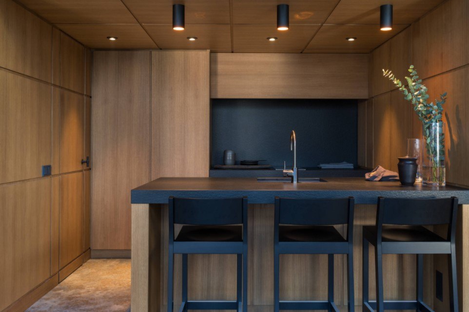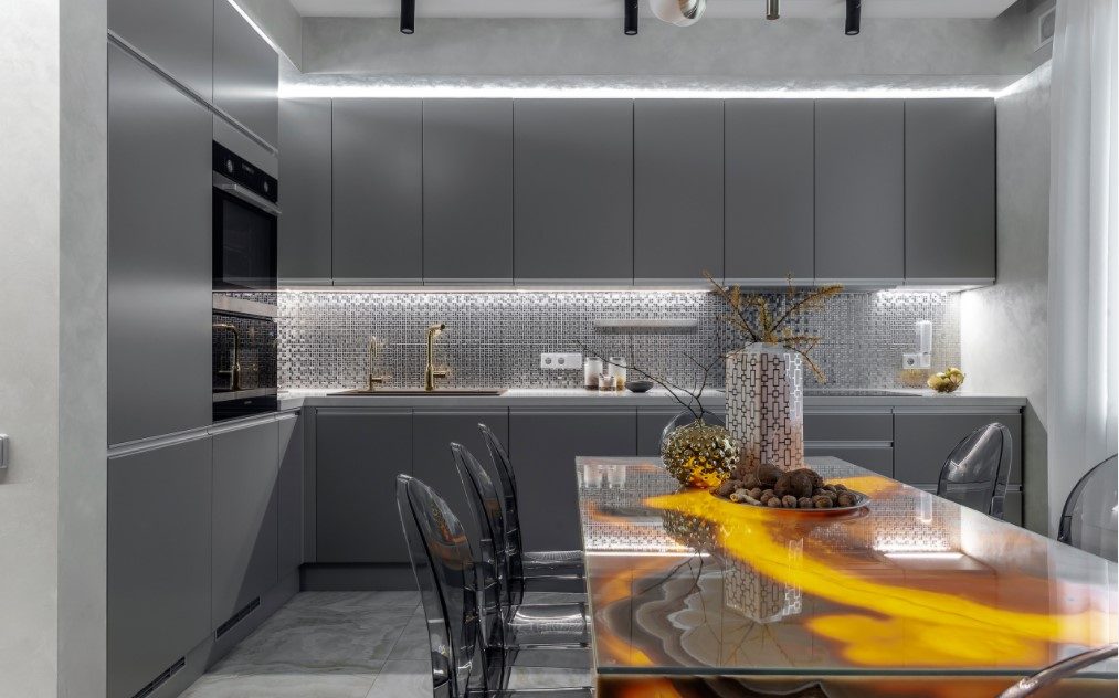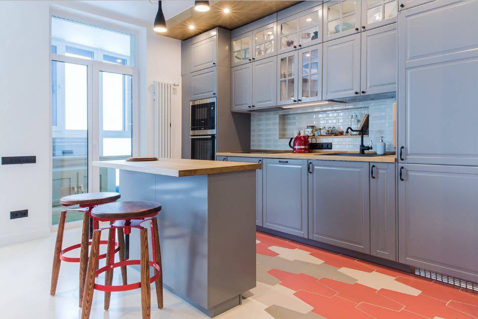 По расположению она может прилегать к стене меньшей или большей стороной. Все зависит от планировки кухни и целей, которые преследует владелец при установке барной стойки. Предполагаемые вместе с ним стулья не должны мешать свободному передвижению по кухне и выходу из-за стола.