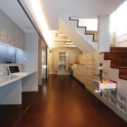 Кто бы мог подумать, что гостиная с серыми глянцевыми фасадами систем хранения, нейтральными шторами и темной мебелью может быть настолько яркой и пестрой только благодаря обоям с необычным рисунком. С помощью освещения на нескольких уровнях удалось грамотно подсветить не только функциональные зоны гостиной, но и создать теплую, уютную атмосферу помещения.