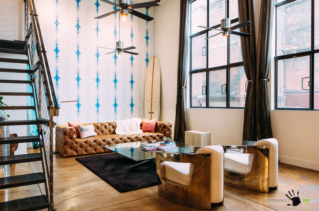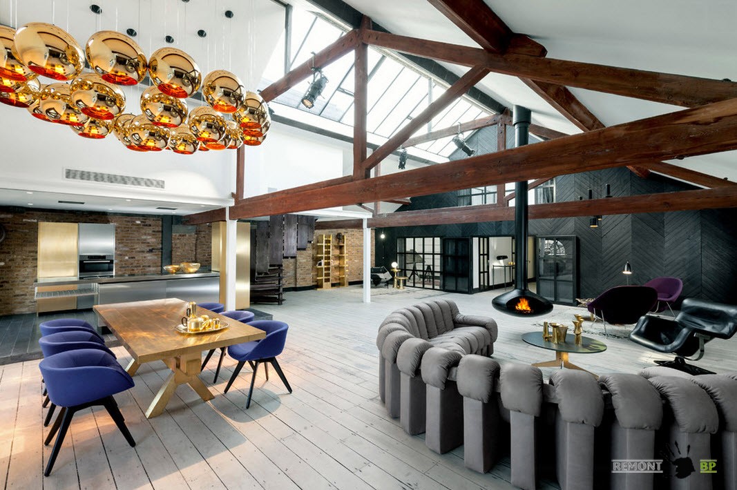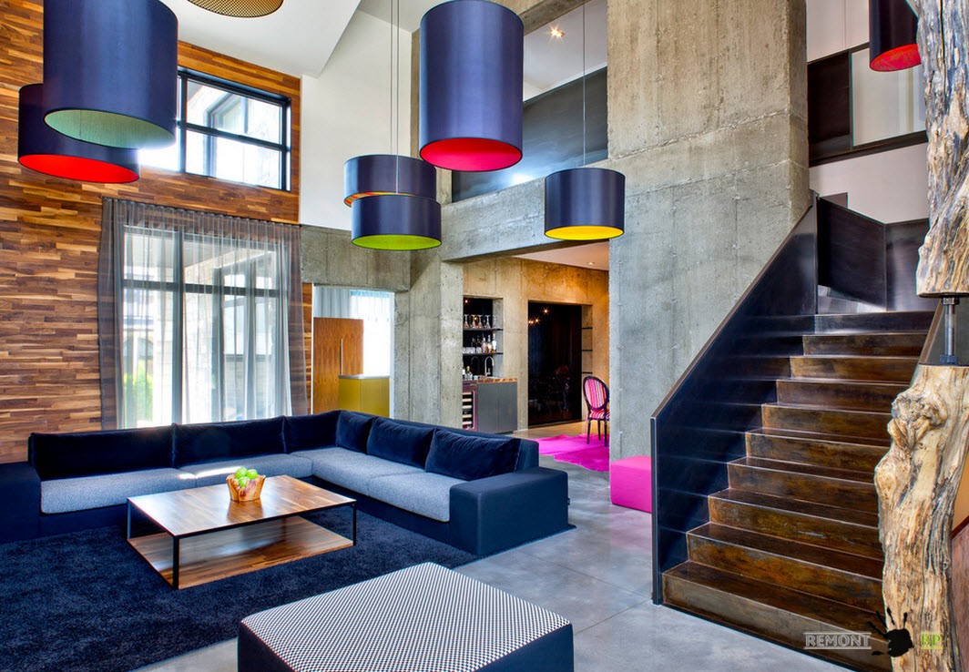 Гостиные с действительно большими масштабами могут себе позволить не просто крупный и объемный декор, но и яркий, колоритный окрас больших элементов интерьера. В большой гостиной с несколько индустриальной отделкой если диван, то огромный и с велюровой обивкой, если люстры, то яркие и большие, если акцентные цвета, то глубокие и насыщенные.