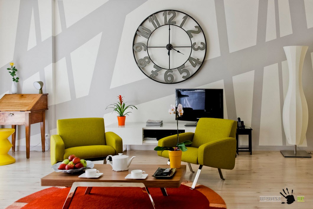 Ярко-горчичный цвет кресел в этой гостиной, безусловно является акцентным. Пожалуй, только апельсиново-рыжий оттенок коврика сможет соперничать с ним за первенство. Но образ общей комнаты не был бы настолько оригинальным без больших настенных часов, оригинального напольного торшера, старинного секретера или дизайнерских подставок.
