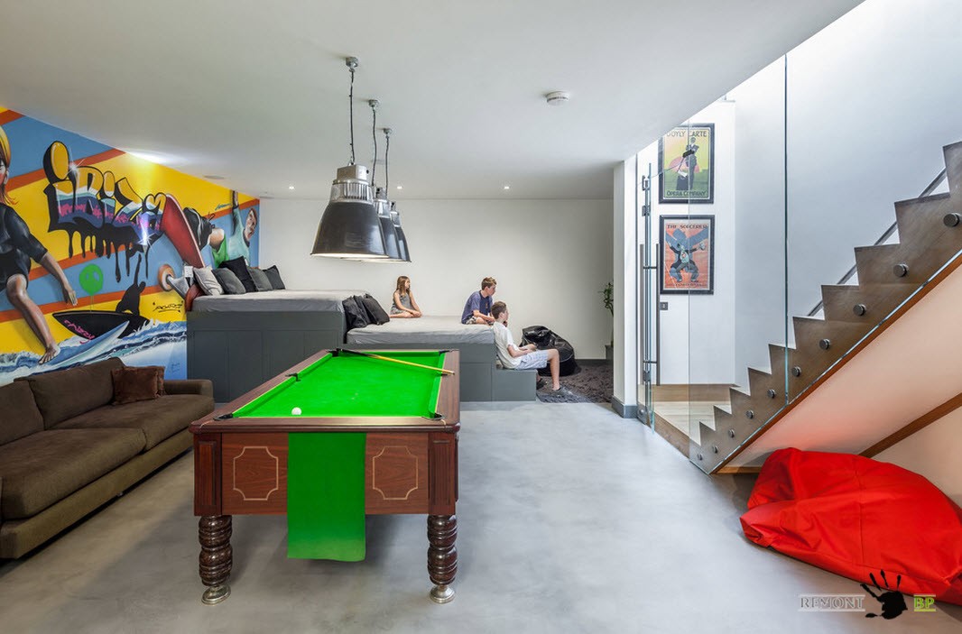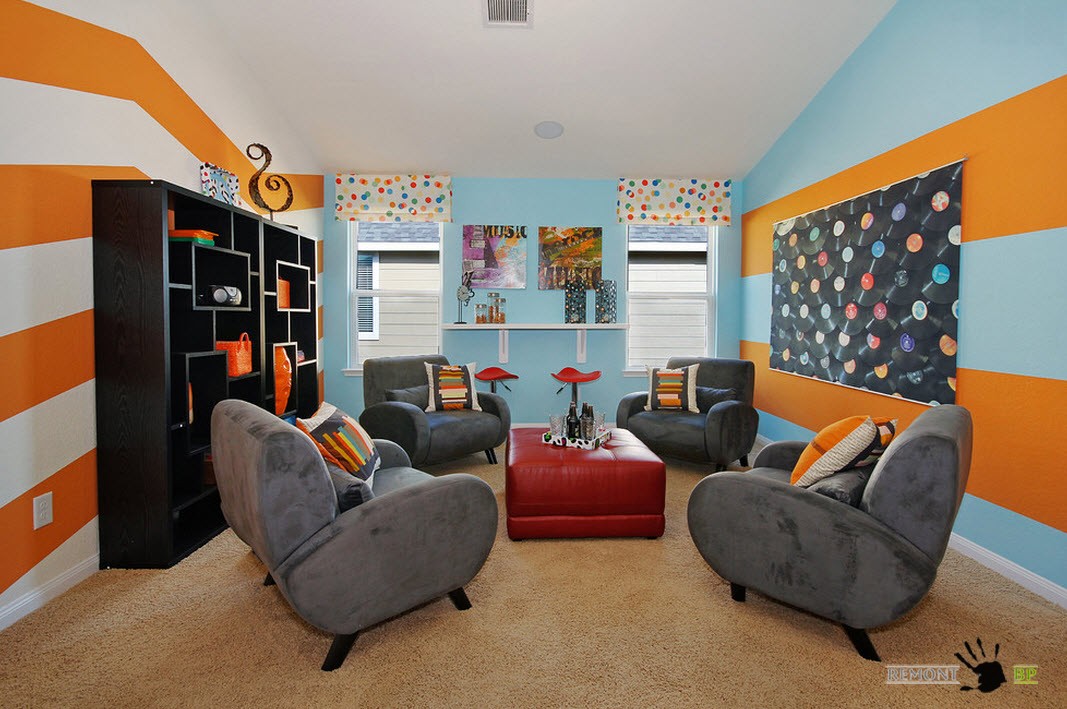Всего лишь одна акцентная стена с ярким, колоритным рисунком в корне меняет интерьер достаточно спокойной и даже скучной гостиной. Совмещение зоны отдыха с игровым сегментом, привносит в дизайн помещения яркие краски и собственные акценты.