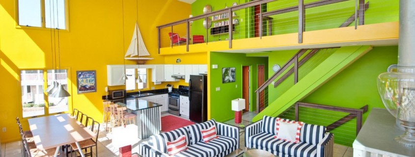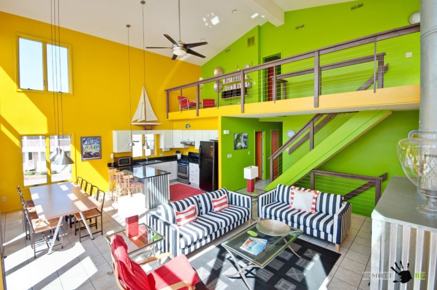 Полосы даже пастельных тонов способны преобразить отделку гостиной, придав фону для настенного декора некоторого драматизма. Но в данной гостиной за колоритность отвечают практичные предметы декора. Когда за окном океан, то хочется и в обустройстве помещений использовать морские мотивы – желтую субмарину в качестве декора или карту поиска сокровищ вместо обычной картины.