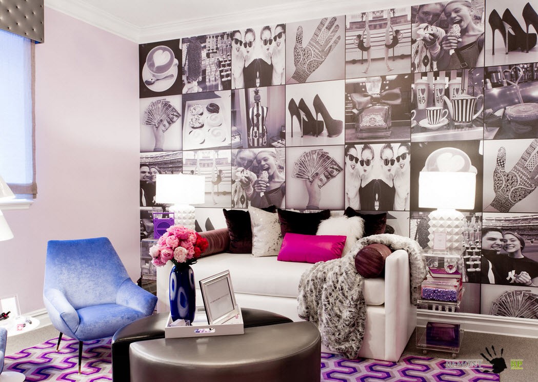 Могут ли черно-белые фото на стенах сделать интерьер комнаты ярче? Ответ на этот вопрос очень красноречиво иллюстрирует дизайн гостиной с необычными фотообоями. Добавьте всего лишь несколько ярких. Акцентных пятен к вашему черно-белому альянсу и колоритный, уникальный интерьер гостиной готов.