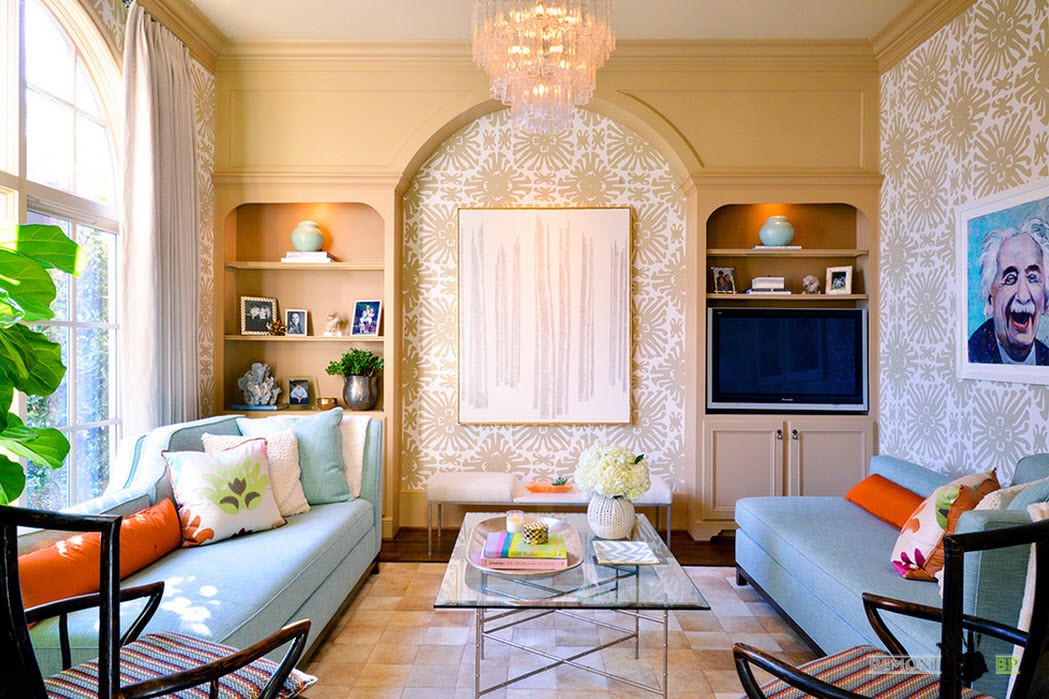 Пестрые обои для стен – интересный интерьер гостиной