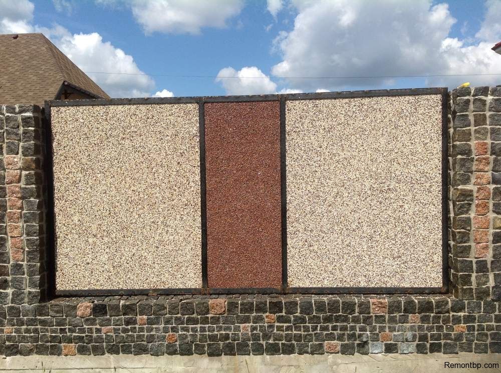 - Наносим сам материал. Для этого ее можно немного разбавить водой и хорошо перемешать, тогда крошка будет более «послушной». Пропорции: на емкость до 20 кг – 1 литр воды, до 25 кг. – 1.5 литра. Далее часть массы налаживаем на поверхность и размазываем сверху вниз, снимая одновременно излишки шпателем. Более 2-3 проходов делать не рекомендуется, ведь можно повредить камушки и впоследствии на поверхности будут образовываться серые пятна. Толщина слоя 1.5 – 2 крошки. Материал сохнет до 12 часов.