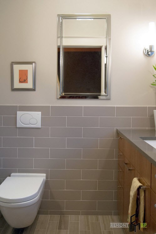 Подбирая под цвет настенного покрытия сантехнику, можно гармонично завершить композицию. Разнообразие оттенков сантехники позволит найти оптимальное сочетание. Интересным может быть использование унитаза из каленого стекла в сочетании со стеклянными блоками. Такой декоративный элемент, как стеклянные блоки отлично гармонируют с кафельной плиткой и позволят разнообразить однотонное покрытие стен.