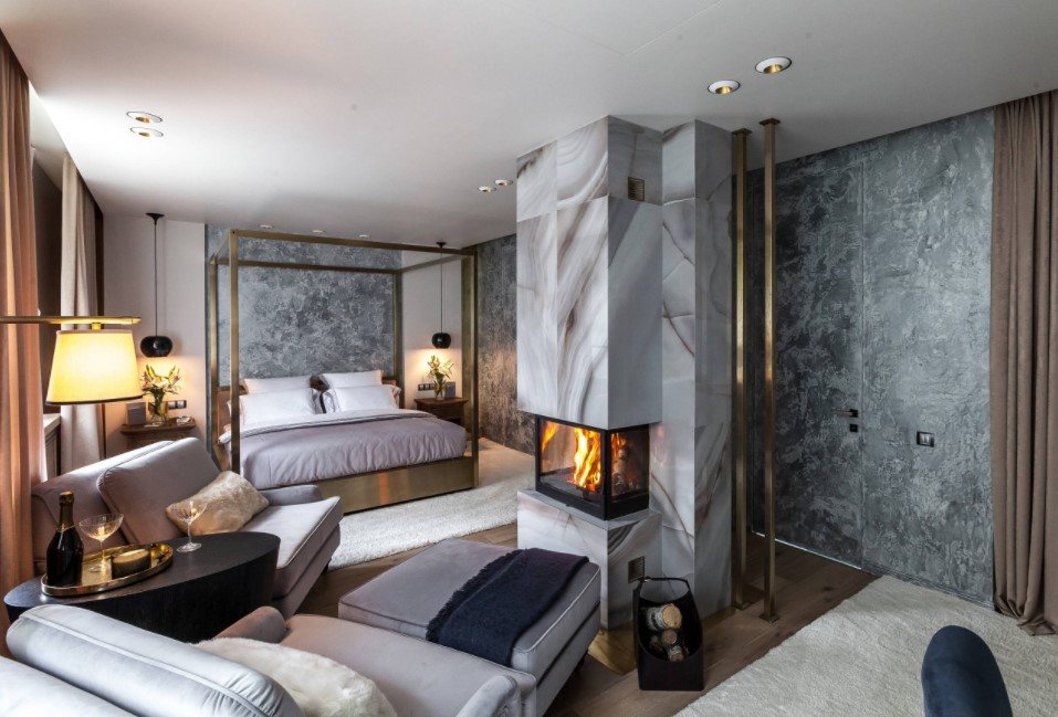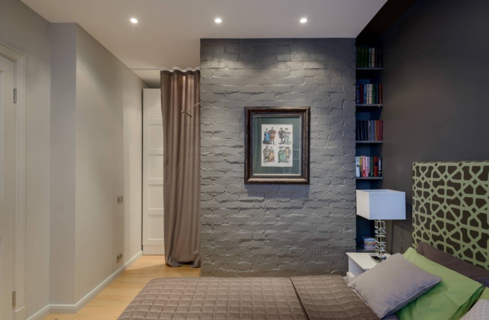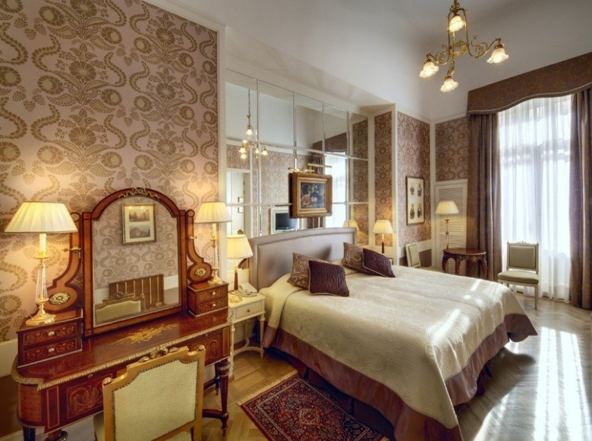 Следующий важный критерий – это планировка спальни, ее форма и размер. Большая спальня квадратной формы может быть оформлена темными обоями с контрастным принтом.