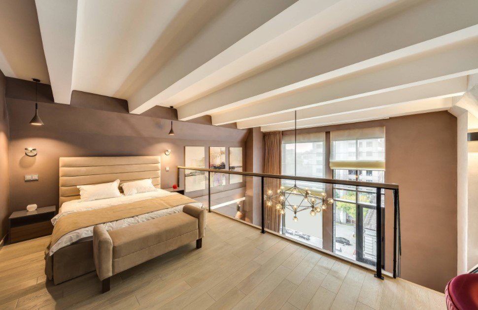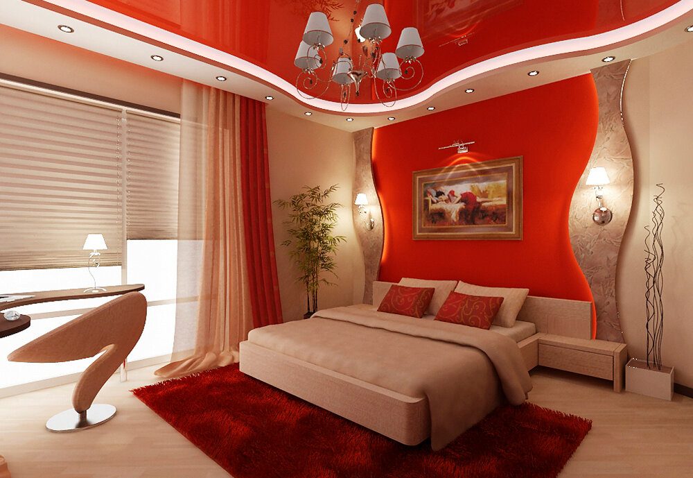 Если потолок высокий (более 2,5 метров), то для такой спальной комнаты будут уместны обои-компаньоны любых видов: с крупным рисунком, ярких оттенков и темных тонов, с горизонтальными полосами и панно.
