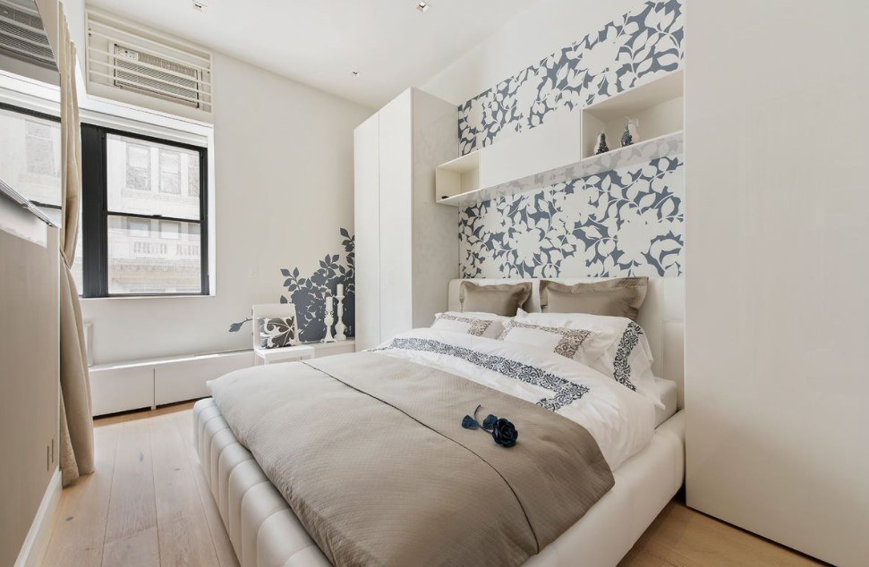 Визуально увеличить небольшую площадь спальни можно с помощью светлых обоев с мелкими деталями и рисунками.
