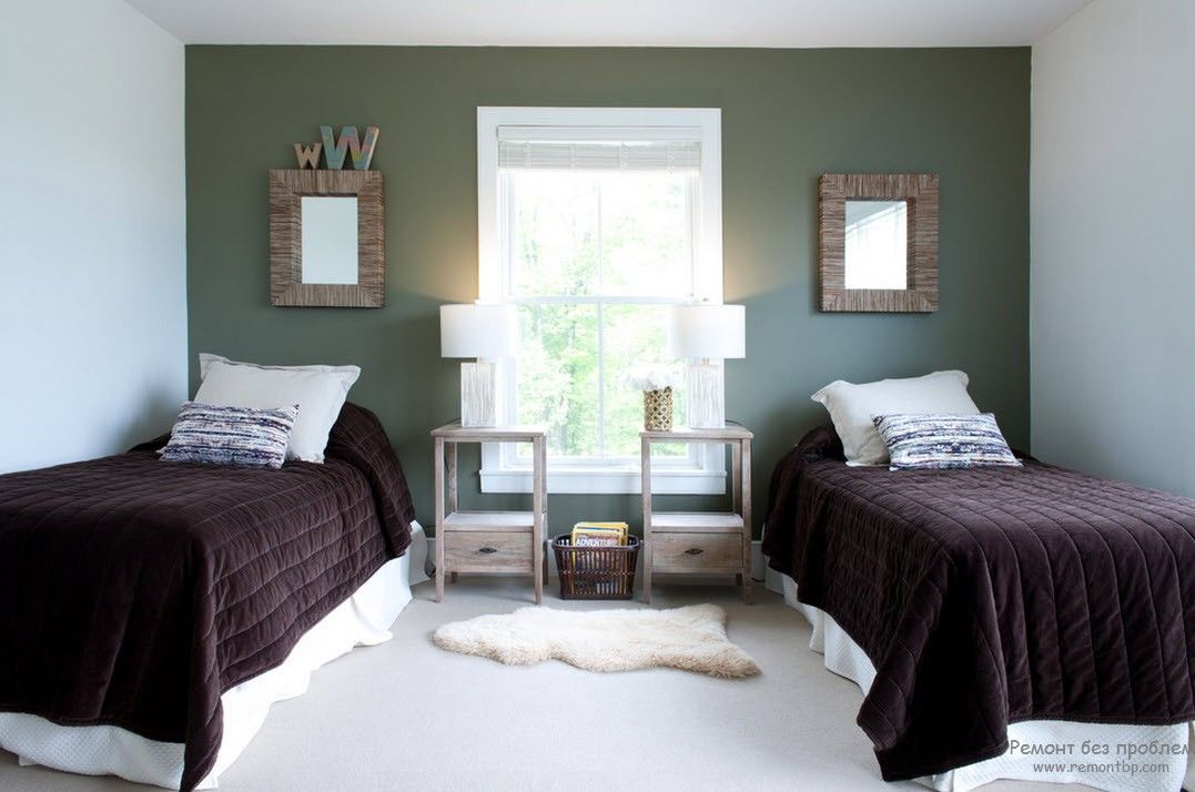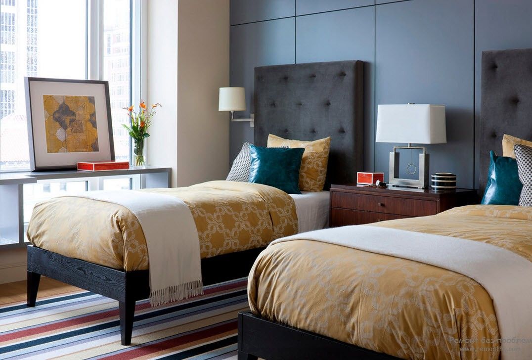 - расположить кровати вдоль стены – данный способ идеален для вытянутых комнат, т.к. кровати размещаются друг за другом вдоль одной стены, при желании между ними можно разместить шкаф или тумбу, или же произвести зонирование при помощи перегородки;