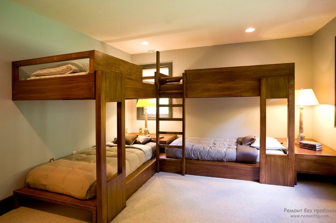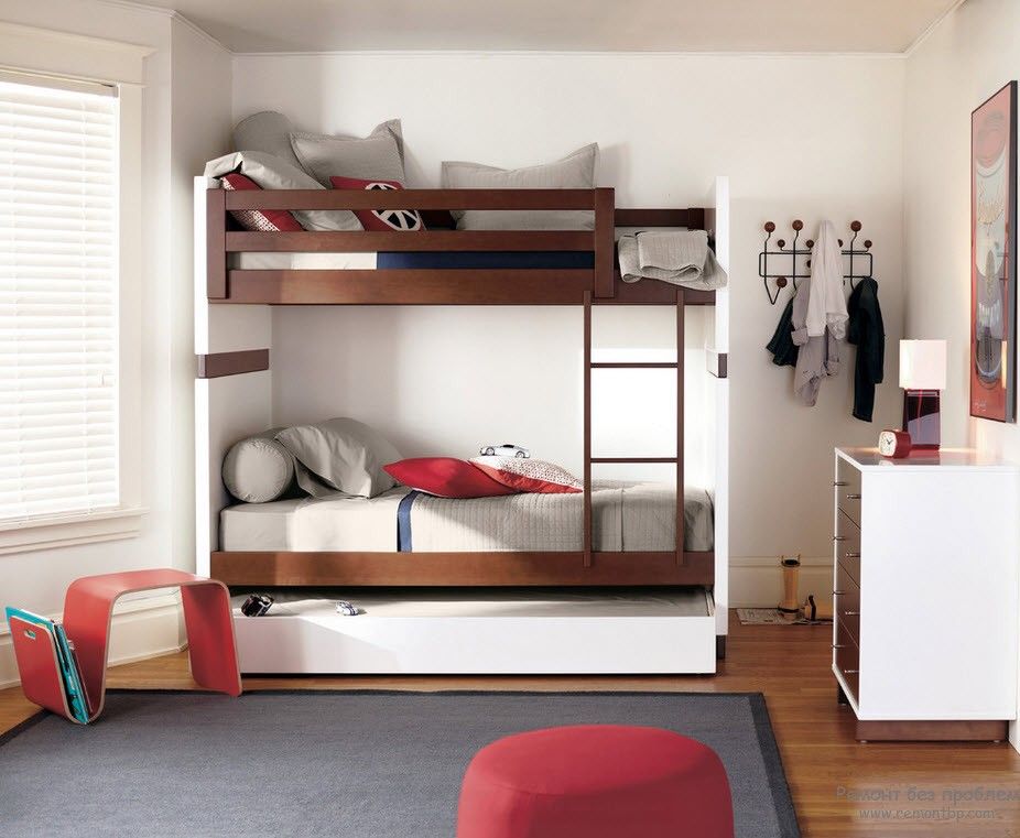 - традиционный способ – параллельное расположение – наиболее подходящий вариант для квадратных помещений, при котором кровати, как в детском садике, стоят рядом, это позволяет детям лучше общаться, правда, в конфликтной ситуации, спасения друг от друга найти будет негде;