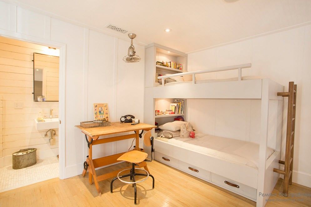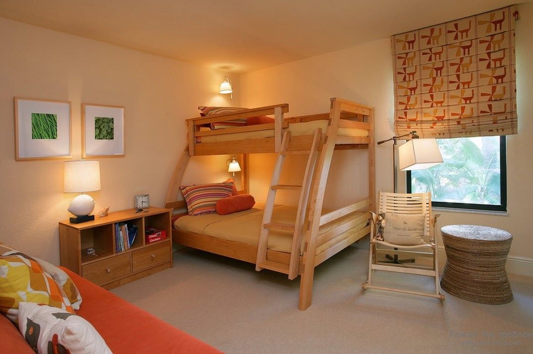 Такой вид кроватей, пожалуй, наиболее актуальный в комнате для двоих детей. Двухъярусные кровати здорово экономят место и в плане дизайна выигрышно смотрятся. Единственный момент, который необходимо учитывать при двухэтажном варианте мебели – это высоту потолков, которая не должна быть менее 2,6 метров. В противном случае на втором этаже ребенку спать будет очень душно.
