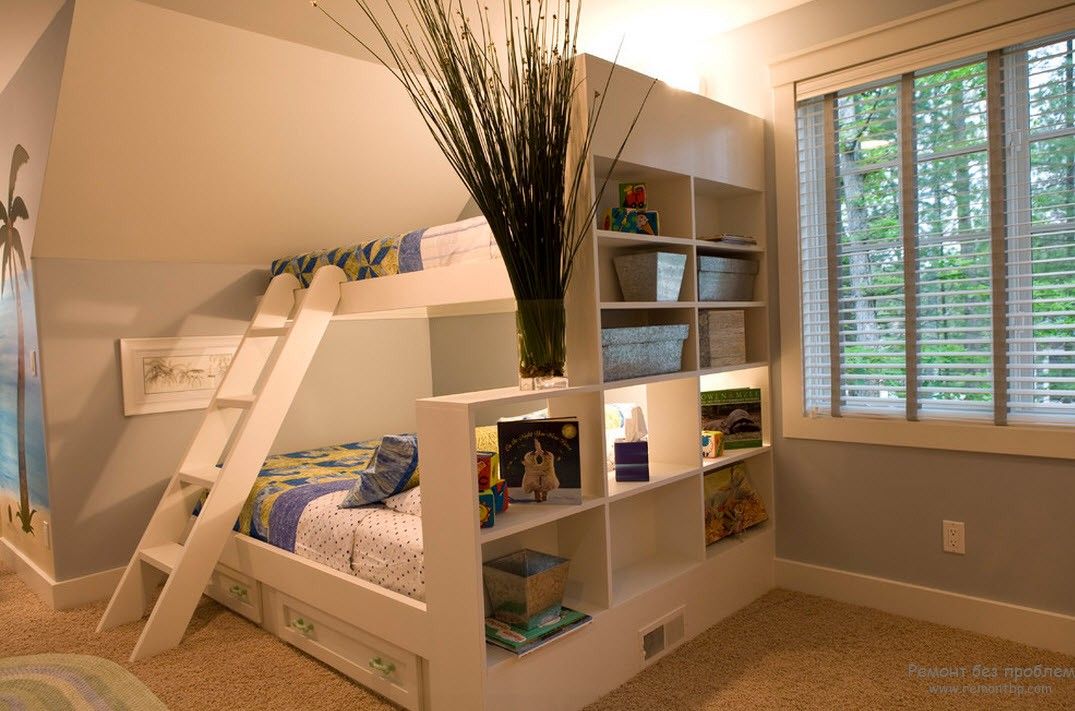 - выделить общие функциональные зоны для двоих детей – это когда кровати детей находятся рядом, впрочем, как и остальные вещи (столы, ящички для хранения разных предметов);