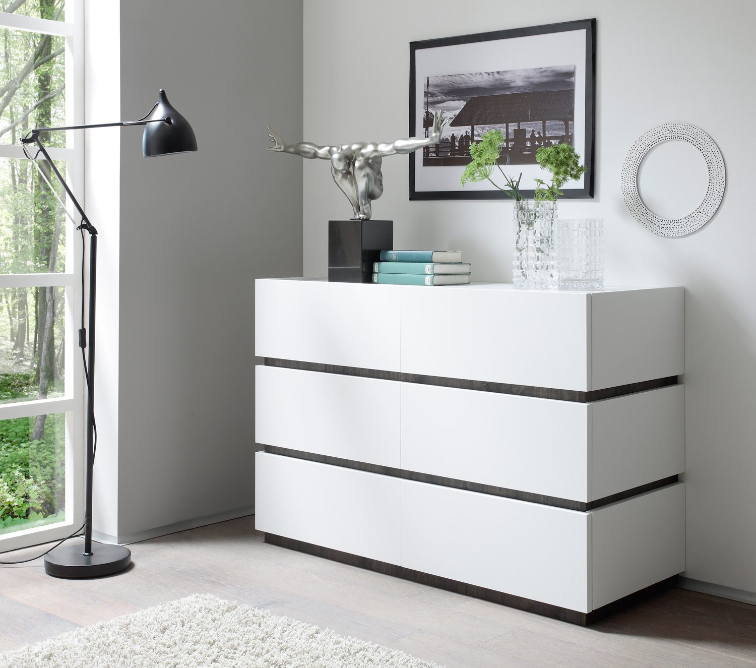 Комод — это умный предмет мебели для хранения. Он впишется как в маленький, так и в просторный интерьер, независимо от его стиля и предназначения. Современные комоды для гостиной также имеют представительную функцию и могут быть использованы для демонстрации декораций.