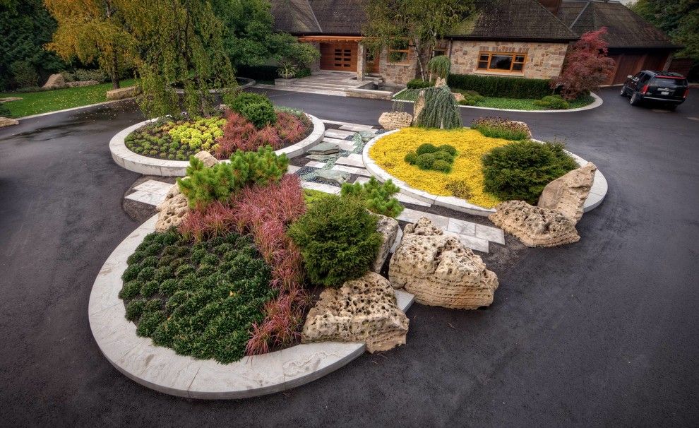 Композиция кругового обзора составляется таким образом, чтобы она одинаково хорошо просматривалась с разных сторон. В форме круга или полукруга выполняют клумбы, цветники, декоративные водоемы, газоны с живыми изгородями, фонтаны, боскеты, внутренние дворики. Круговая композиция очень удобна и отличается невероятным стилем и эффектностью.