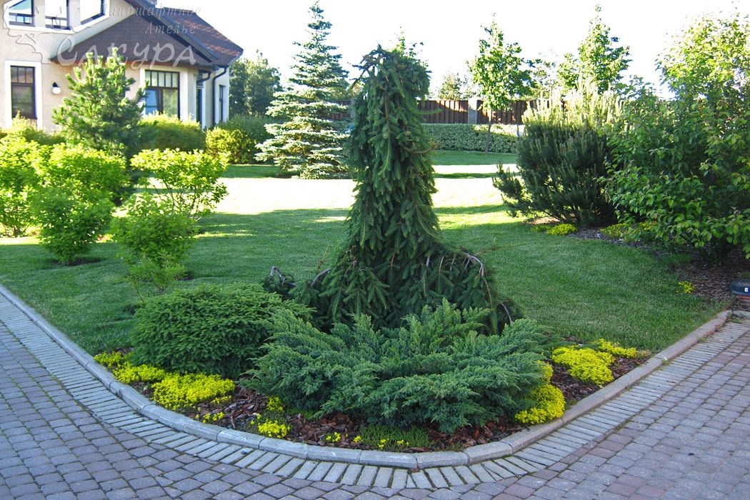 Также можно выбрать и форму композиции из хвои: клумба, аллея, изгородь, альпийская горка, рокарий, солитер, бордюр.