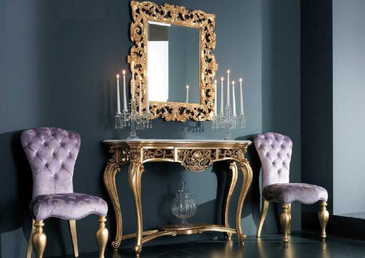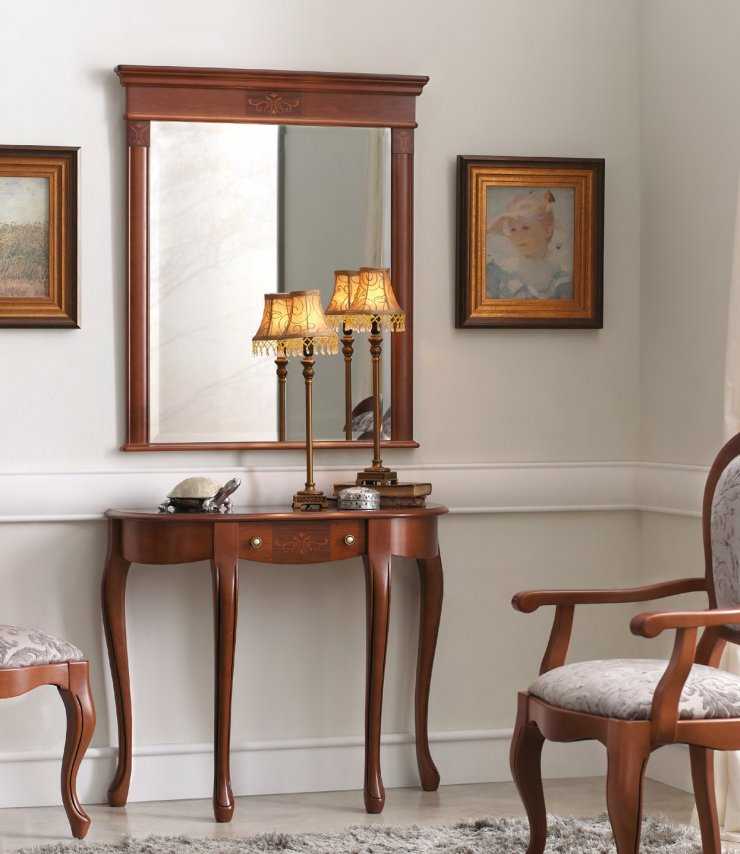 Для дополнения интерьера в классическом стиле дизайнеры рекомендуют использовать модели консоли из древесного массива, с характерными элементами резьбы, блеска платины или позолоты. Это может быть изделие, выполненное в простом либо более изысканном стиле. Актуальные расцветки – коричневые или бежевые тона. Для конструкций с зеркалом характерно присутствие резной рамы. В качестве дополнения зачастую используются подсвечники, вазы и прочие декоративные элементы.