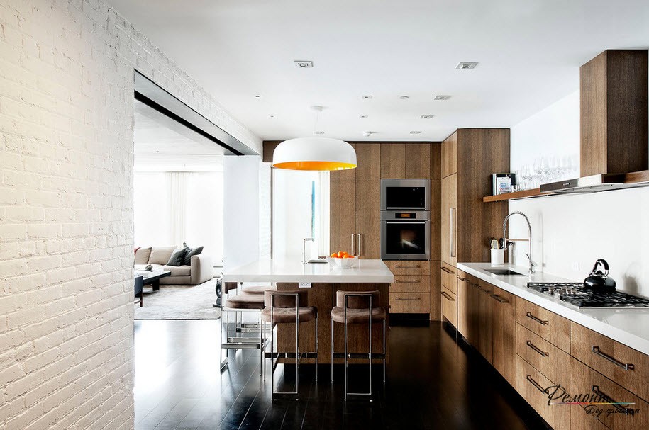 Тандем темного напольного настила и белых стен можно считать самым универсальным. Здесь фантазия дизайнера не знает границ. Практичность темного пола компенсируется подсветкой от белых поверхностей.