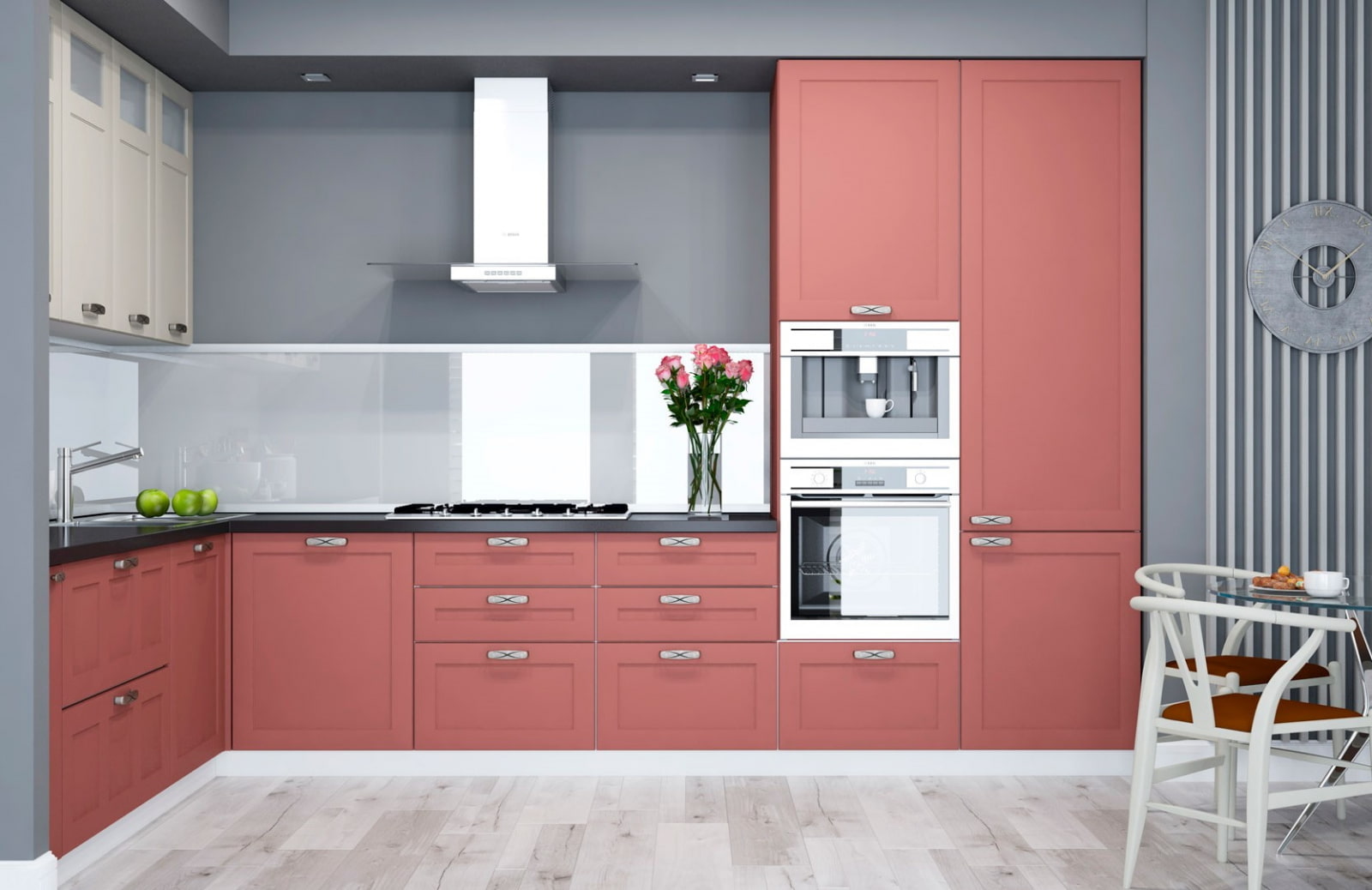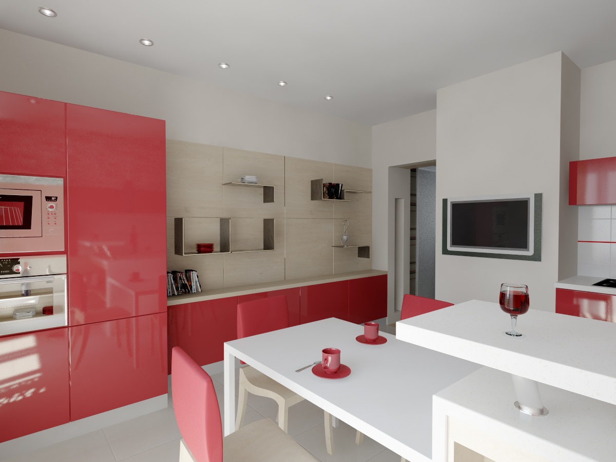 В дизайне интерьера кухни цвета коралла возможно два варианта. Коралловыми становятся поверхности – стены, фартук над кухонным столом для приготовления пищи, пол. Для второго варианта характерны коралловые фасады кухонной мебели, оформление окон, многочисленные кухонные принадлежности, аксессуары, элементы декора. И в первом и во втором случае очень важно подобрать гармоничный оттенок, прекрасно сочетающийся с коралловым, например, белый, серый, бежевый.