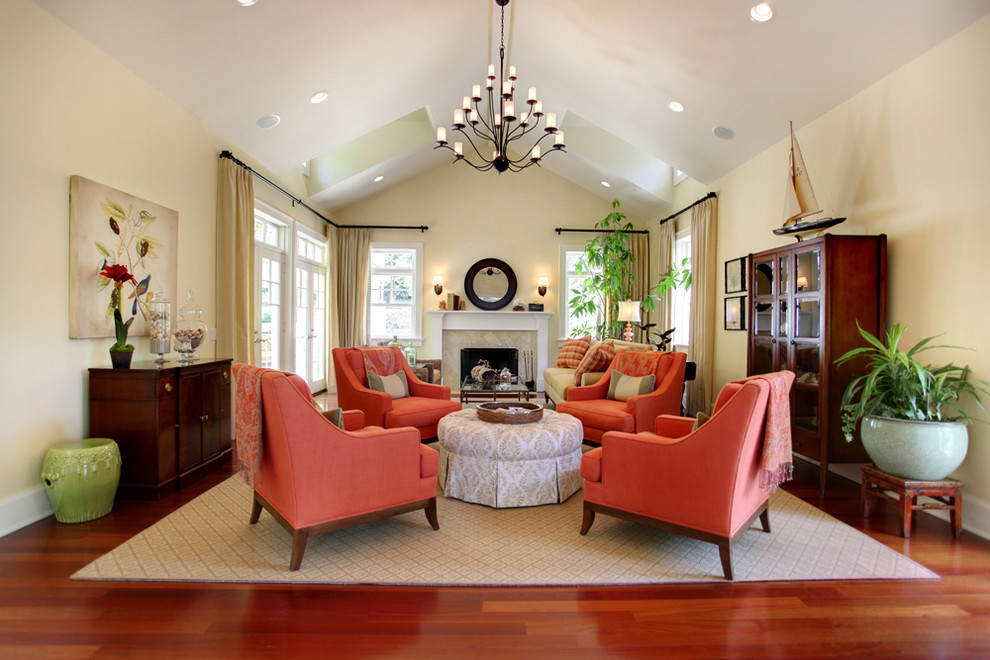 В роскошной гостиной вполне уместен пол натурального цвета кораллов. Это могут быть линолеум, ковролин, ламинат, большой ковер в этом теплом цвете. Очень эффектным выбором для стильной гостиной станет мягкая мебель с обивкой коралловых оттенков.