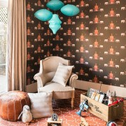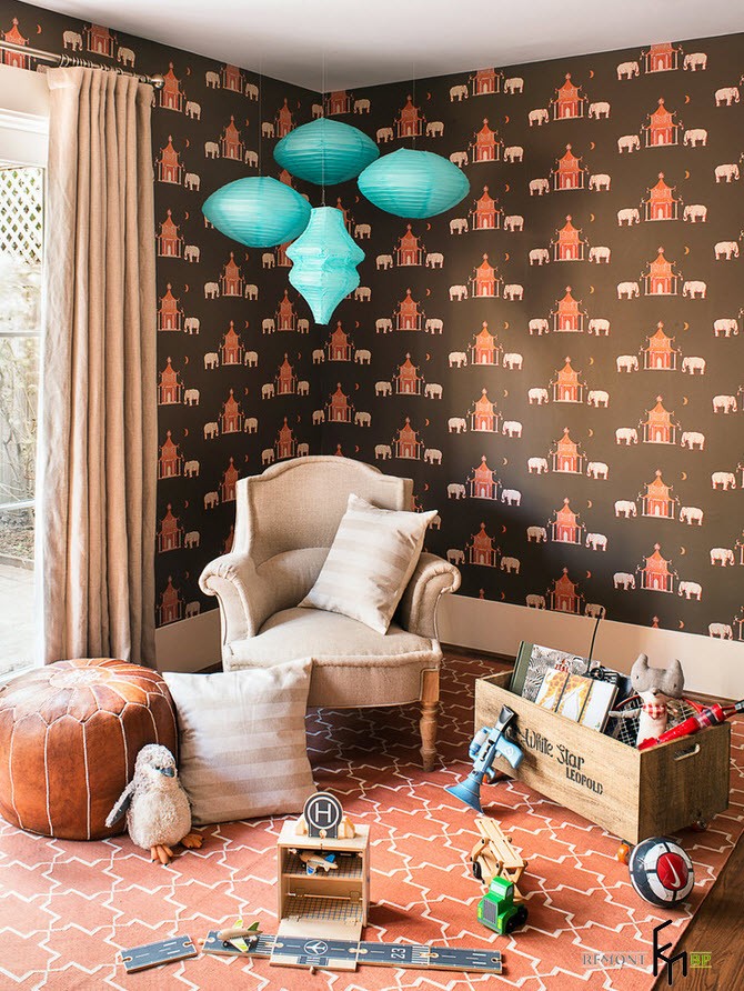 Темные обои с ярким оранжевым рисунком, голубая люстра и мебель нейтрального бежевого цвета создадут отличный ансамбль в детской комнате.