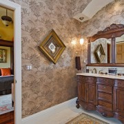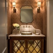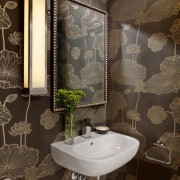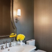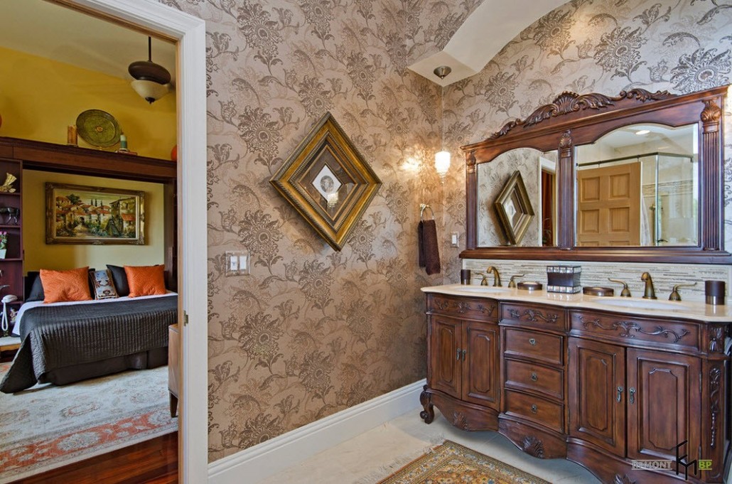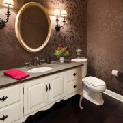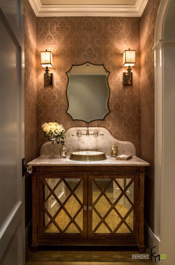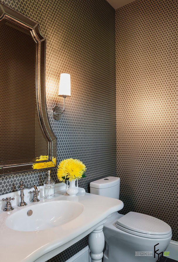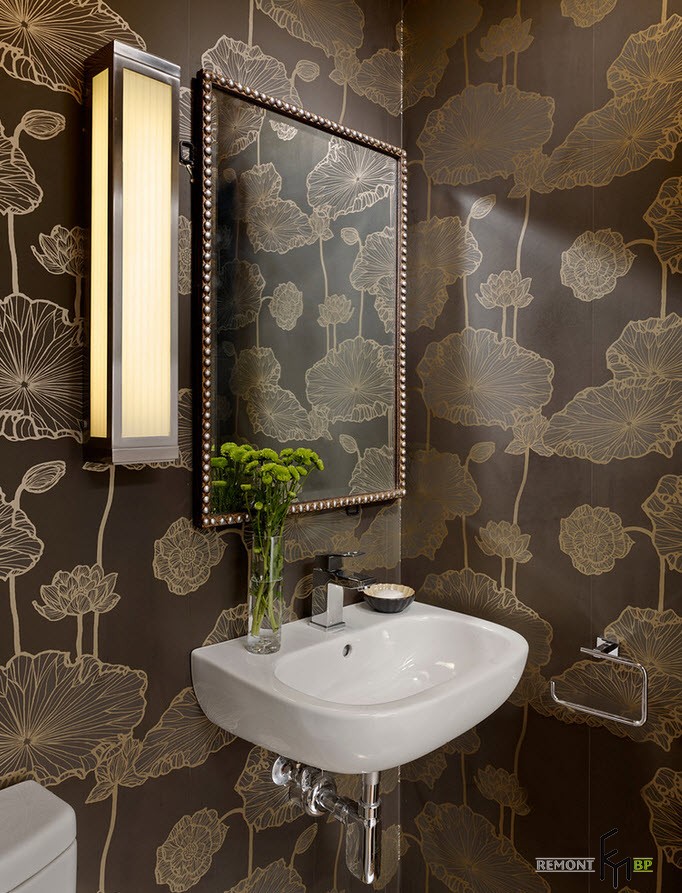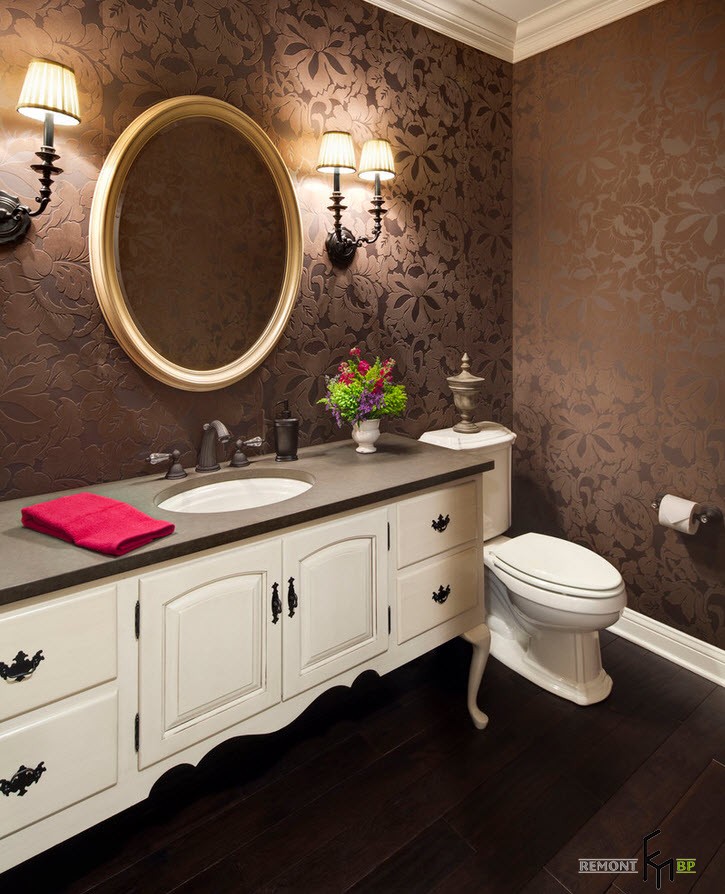 Еще одна интересная идея применения данного сочетания – это уборная. Белая сантехника, зеркала и яркие светильники будут просто неотразимы на темно-коричневом фоне. Для уборной лучше всего подобрать переливающиеся коричневые обои, от которых будет отражаться свет от ламп. Таким образом помещение будет казаться больше, даже не смотря на то, что стены в нем темные.