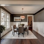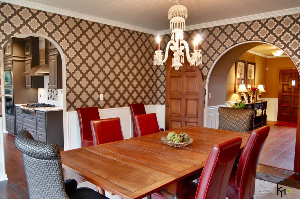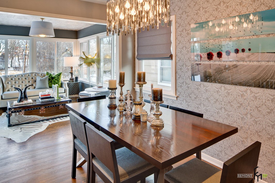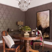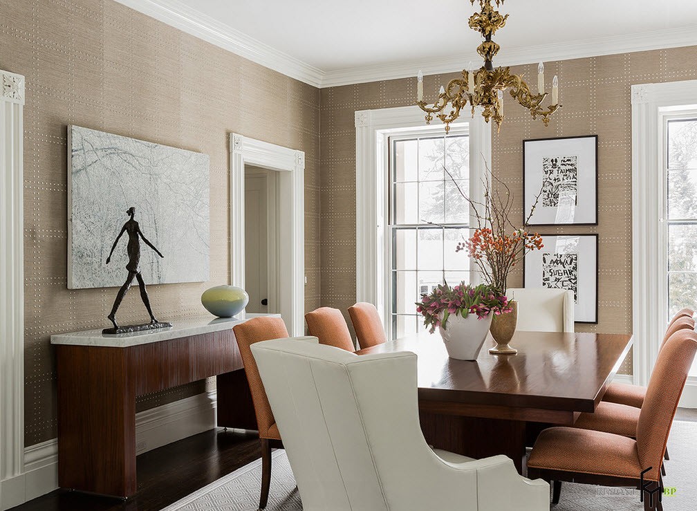 Сочетание темно коричневого и белого отлично будет смотреться в столовой, где можно соединить не только обои разных оттенков, но и мебель. У стены в темно-коричневом цвете гармонично будет смотреться шкаф из темных пород дерева, а вот светлые стулья или кресла у обеденного стола создадут отличный тандем со светлым потолком и остальными стенами.