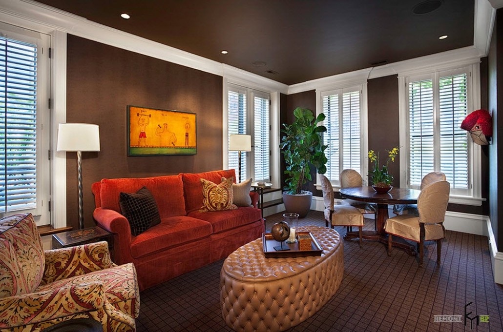 Не исключением здесь остаются и такие комнаты, как гостиная или столовая. Велюровый диван яркого морковного цвета просто замечательно будет выглядеть на фоне стен шоколадного цвета. Отличным дополнением в такой картине станут невысокие белые панели, оконные рамы и потолочные плинтуса.