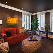 Пожалуй, самыми яркими компаньонами темно коричневых оттенков являются оранжевый и красный цвета. Отрешенность и абстрагирование от внешнего мира, которые олицетворяет коричневый в сочетании с уверенностью в собственных возможностях и силах, подталкивающих к действию, заключенных в красных и оранжевых оттенках, создадут мощный психологический коктейль, способный не только восстановить силы после рабочего дня, но и зарядить энергией. Но помимо влияния на психоэмоциональное состояние человека подобная комбинация цветов в интерьере смотрится очень органично и красиво.
