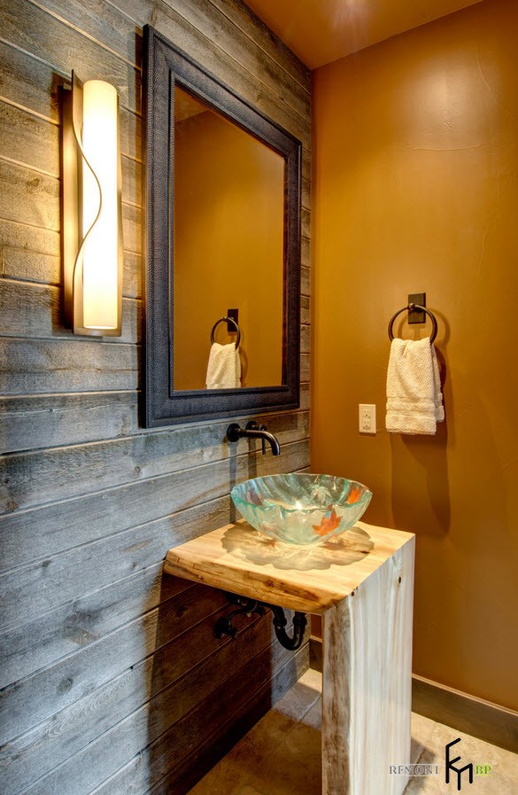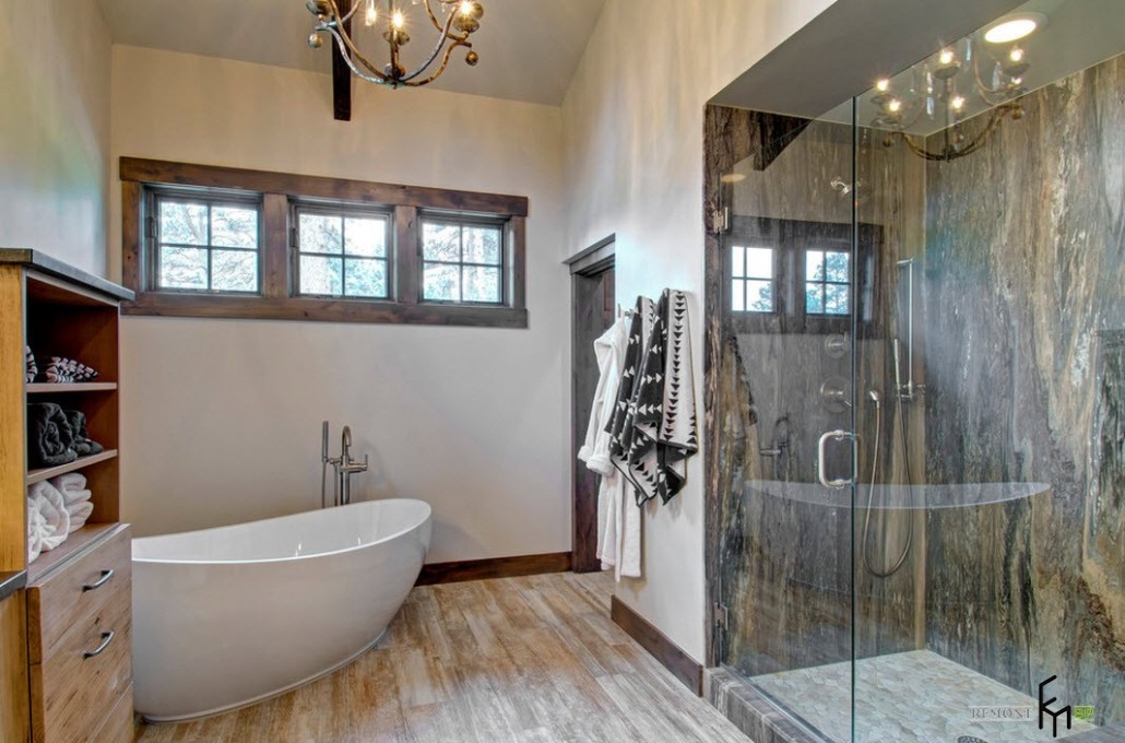 Просторная ванная комната тоже оформлена деревом. Фасады мебели, потолочные балки и оконные рамы выполнены из различных сортов древесины. Необычная по форме белая ванна дополняет общее приятное впечатление от комнаты. Изюминкой интерьера стала роскошная подвесная люстра из металла, имитирующая старинные осветительные приборы.