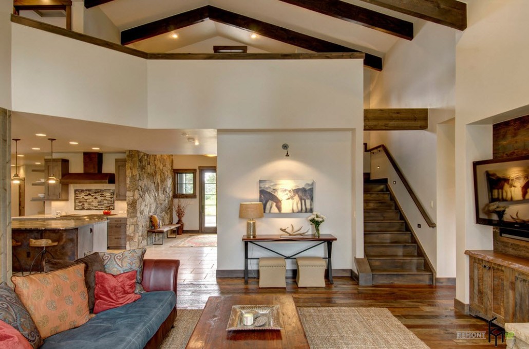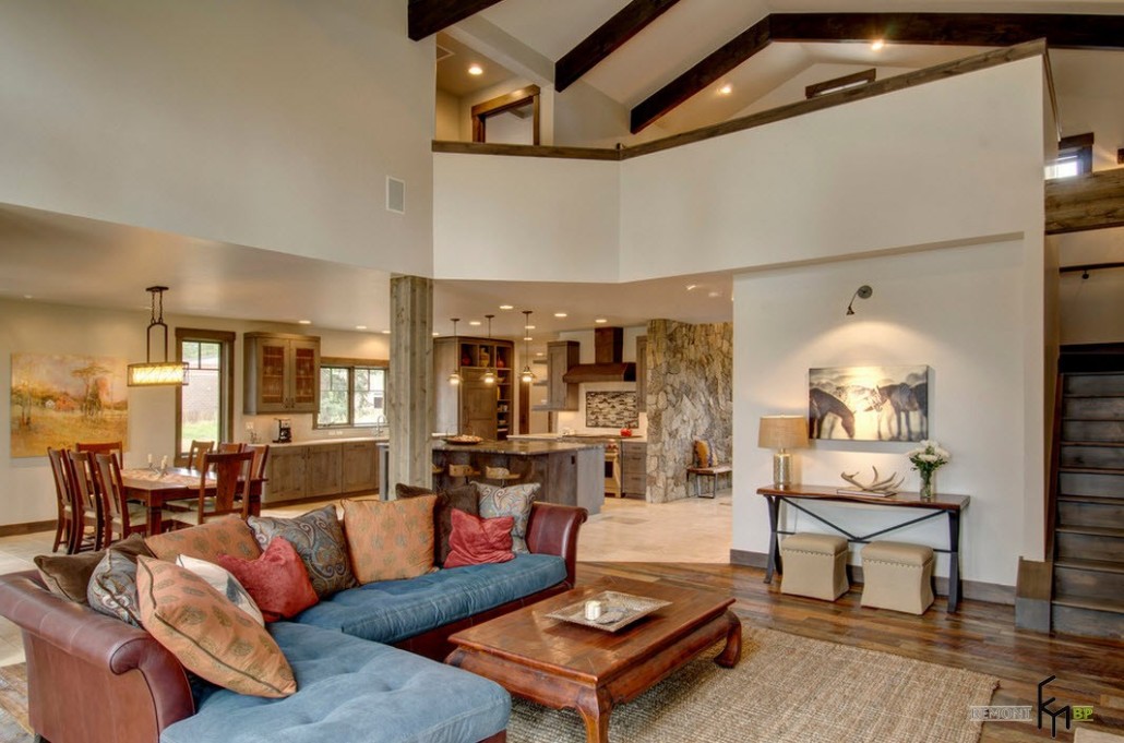 Общий принцип дома – это зонирование пространства. Дверей в оформлении немного. Остальное же помещение разделяется напольными покрытиями, освещением и мебелью. На второй ярус ведет деревянная лестница.