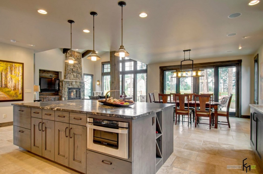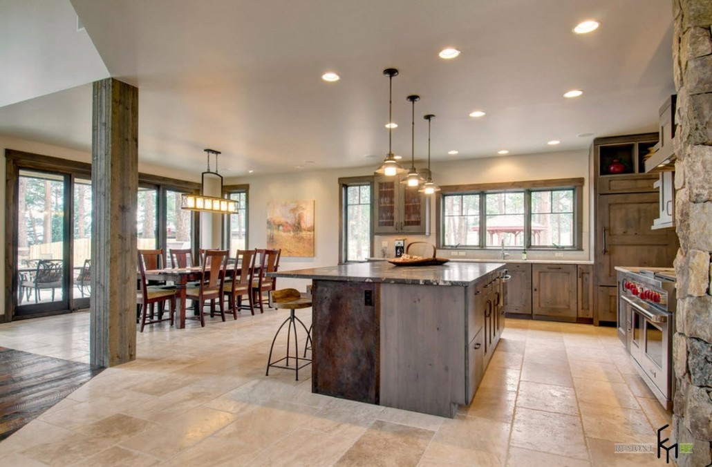Кухня, совмещенная со столовой, освещена светильниками различных разновидностей. При желании можно использовать утопленные в потолке лампы. А семейный ужин украсит подвесная люстра, расположенная прямо над столом. Рабочая поверхность имеет большую площадь благодаря использованию двух столов. Удобным дополнением будут высокие барные стулья.