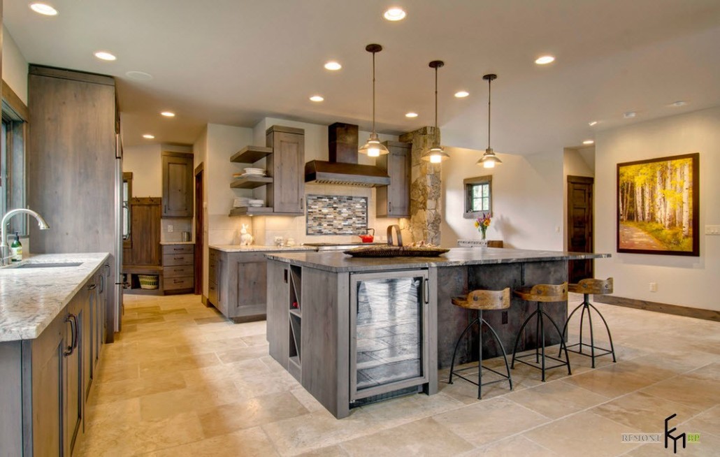 Хромированное покрытие кухонной техники отражает в себе деревянные фасады мебели. Такая игра света делает интерьер очень необычным и загадочным. Вместе с тем дизайнеру удалось совместить современные тенденции с натуральными деревенскими мотивами.