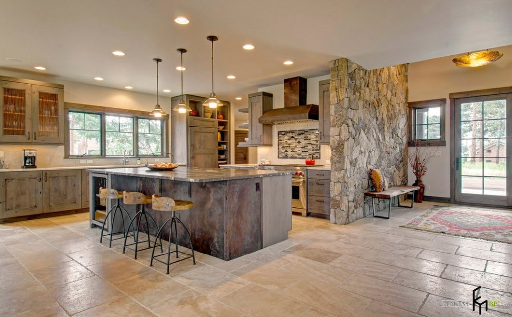 В качестве декора такой кухни уместно выглядит лесной пейзаж на одной из стен. Фартук над плитой, выполненный мозаикой, смотрится очень эффектно и гармонично вливается в интерьер.