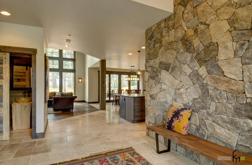Центральной фигурой в гостиной становится камин. Он тоже оформлен натуральным камнем, чем вносит в интерьер гармонию. Защитная дверца позволяет использовать настоящий огонь без риска возгорания. Большой кожаный диван красного цвета является ярким пятном в интерьере, оформленном натуральными красками.