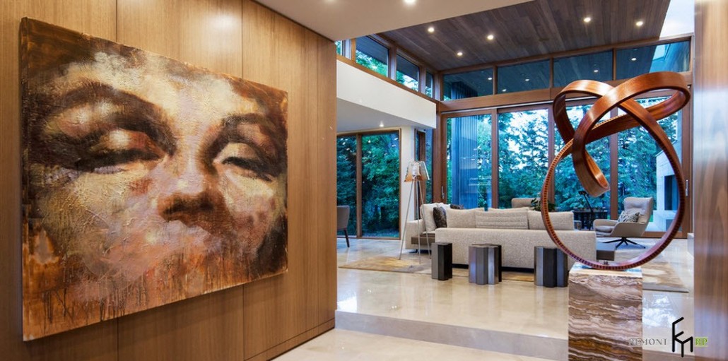 Большая гостиная характеризуется объемным пространством. Натуральные спокойные цвета мебели и покрытий разбавлены яркими цветами на картинах, которыми украшены стены. Мягкий диван выглядит очень удобным. Узкий стол, расположенный прямо у стены совершенно пуст. Обилие элементов декора и мелких аксессуаров не свойственны такому стилю.
