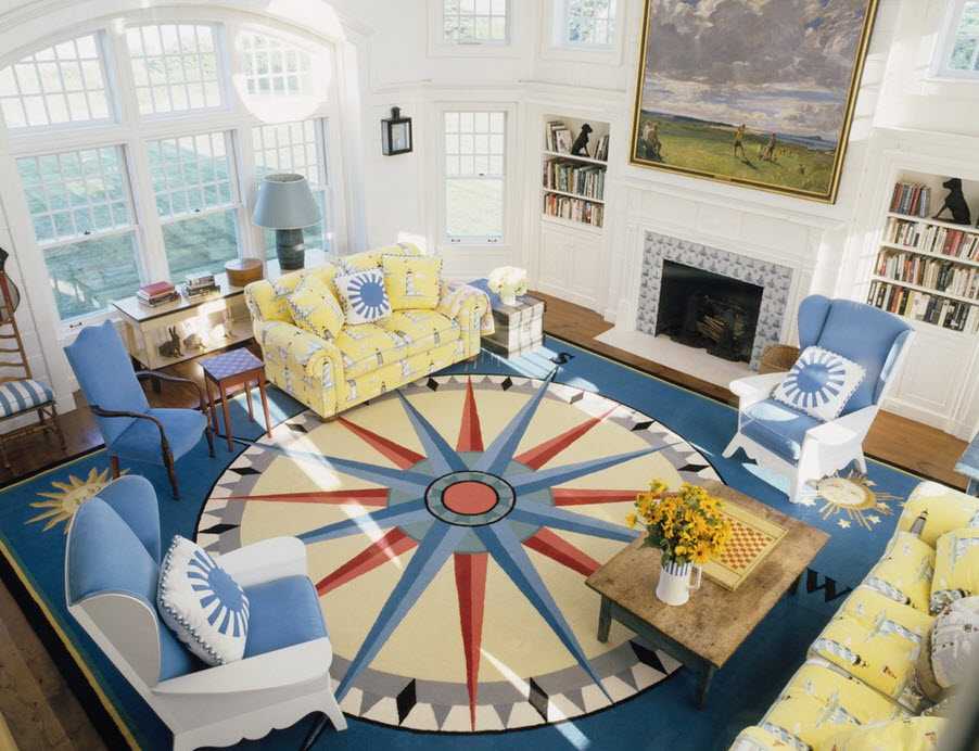 Если вы решили положить круглый ковер, то он должен закрывать не более половины площади пола. Среди предметов мебели должны быть круглые элементы. Это могут быть плафоны, столик или другие предметы.