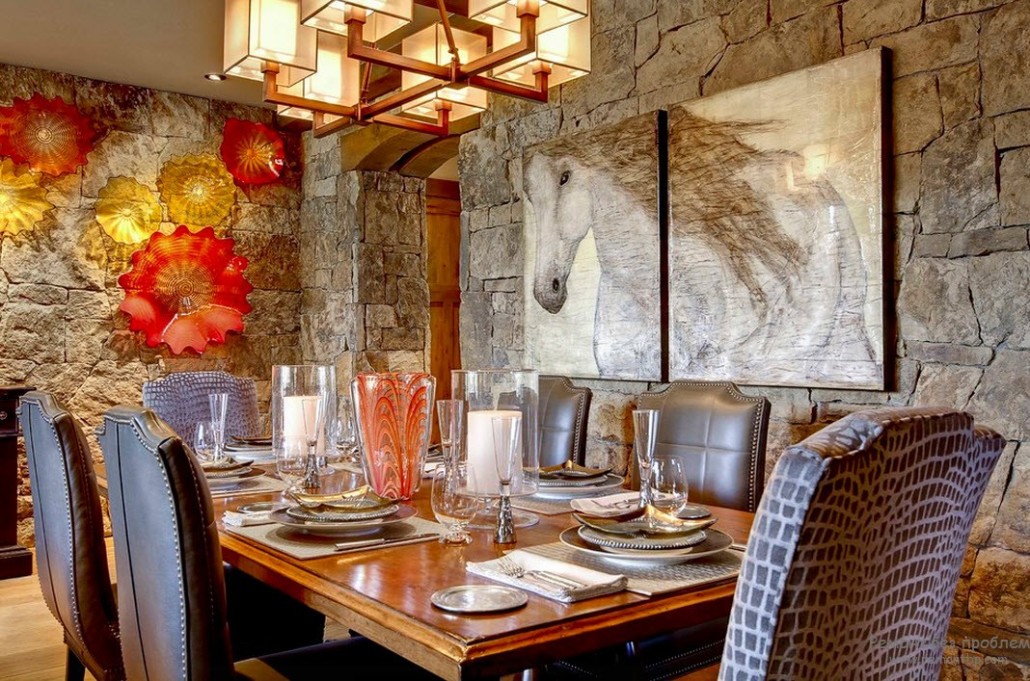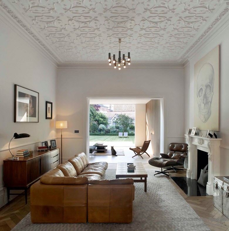 Довольно часто сегодня дизайнеры обращаются к приему отделки кожей стен и потолка. Для этого существуют даже кожаные обои и кожаная отделочная плитка, правда, пока еще не в любом магазине, но интерес к этому материалу стремительно растет. А используется данный вид отделки для интерьеров классического и этнического стилей. Наиболее распространенным способом является имитация кожи страуса или крокодила. Также могут комбинироваться фрагменты натуральной и искусственной кожи.
