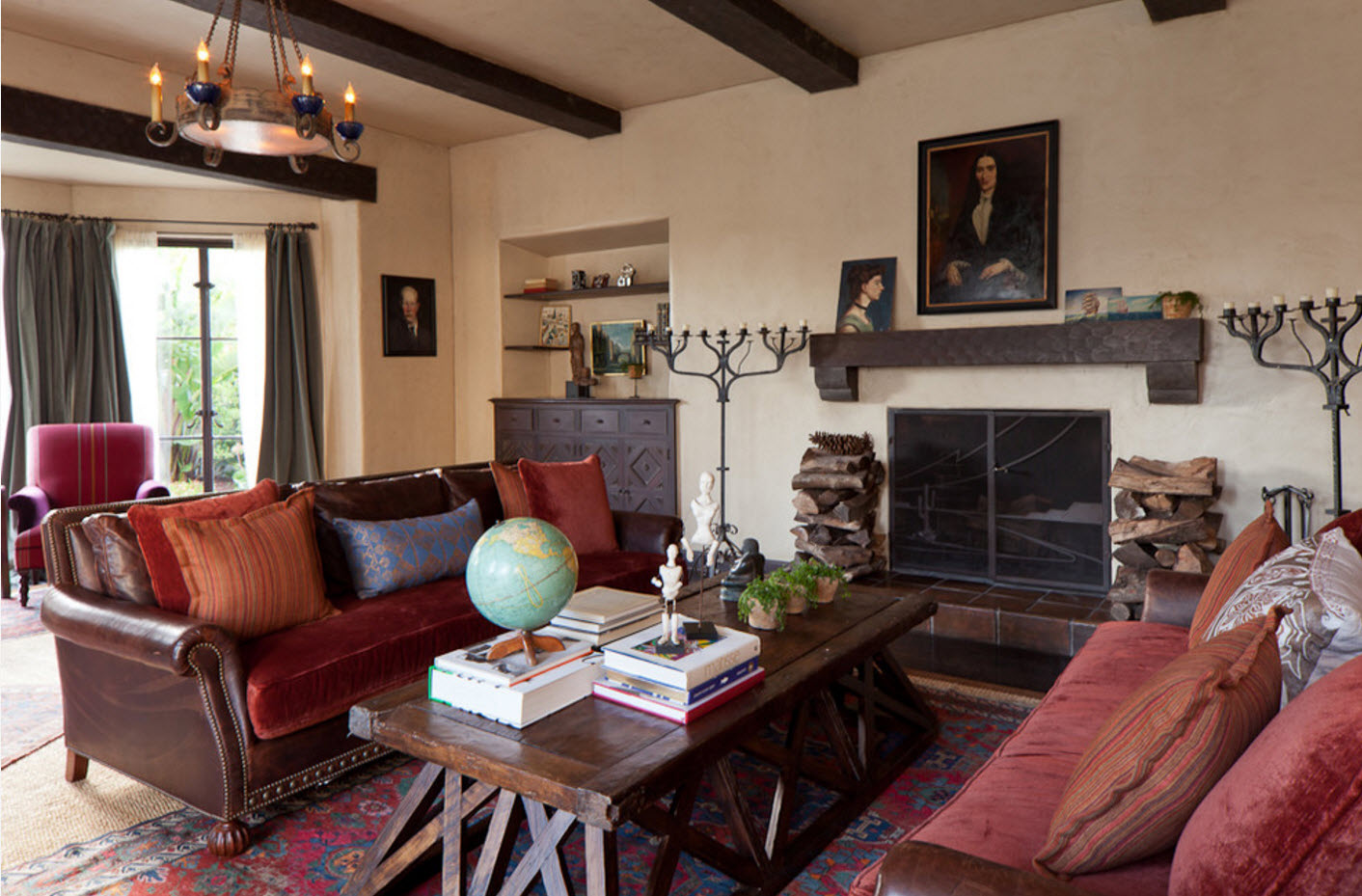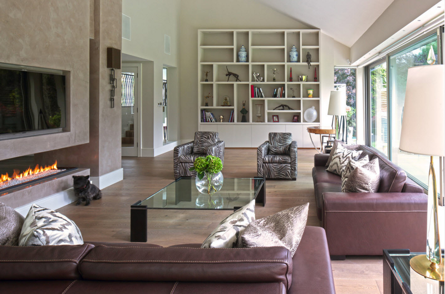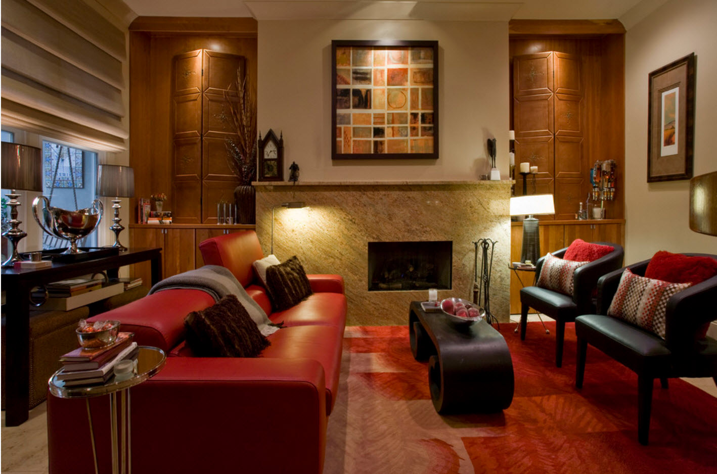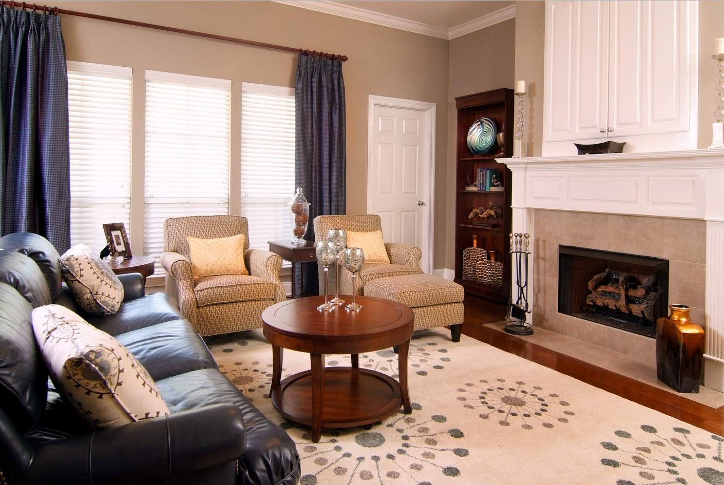 Еще одна очевидная возможность обустройства зоны отдыха в гостиной – установка дивана напротив камина. Логично, что хозяевам захочется наблюдать за игрой пламени в очаге, расположившись с максимальным комфортом. Но расположение столь масштабного предмета мебели практически посередине комнаты возможно только в помещениях средних и больших размеров (немало зависит и от масштабов самого дивана).
