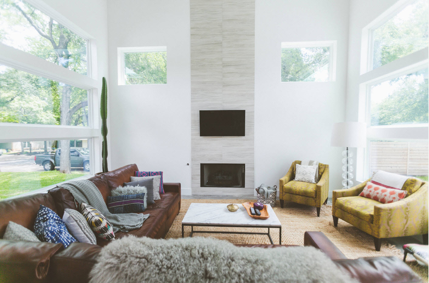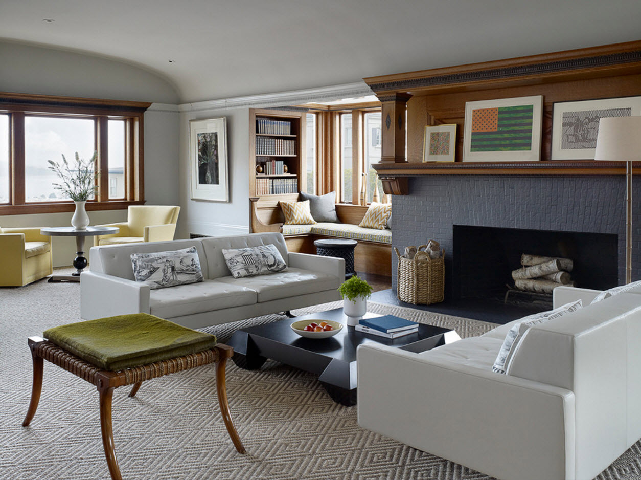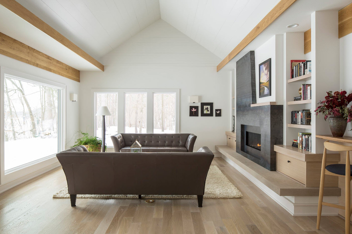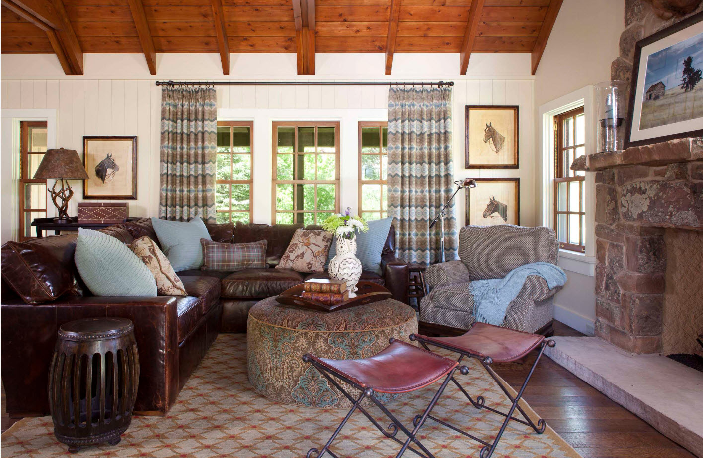 Еще одна очевидная возможность обустройства зоны отдыха в гостиной – установка дивана напротив камина. Логично, что хозяевам захочется наблюдать за игрой пламени в очаге, расположившись с максимальным комфортом. Но расположение столь масштабного предмета мебели практически посередине комнаты возможно только в помещениях средних и больших размеров (немало зависит и от масштабов самого дивана).