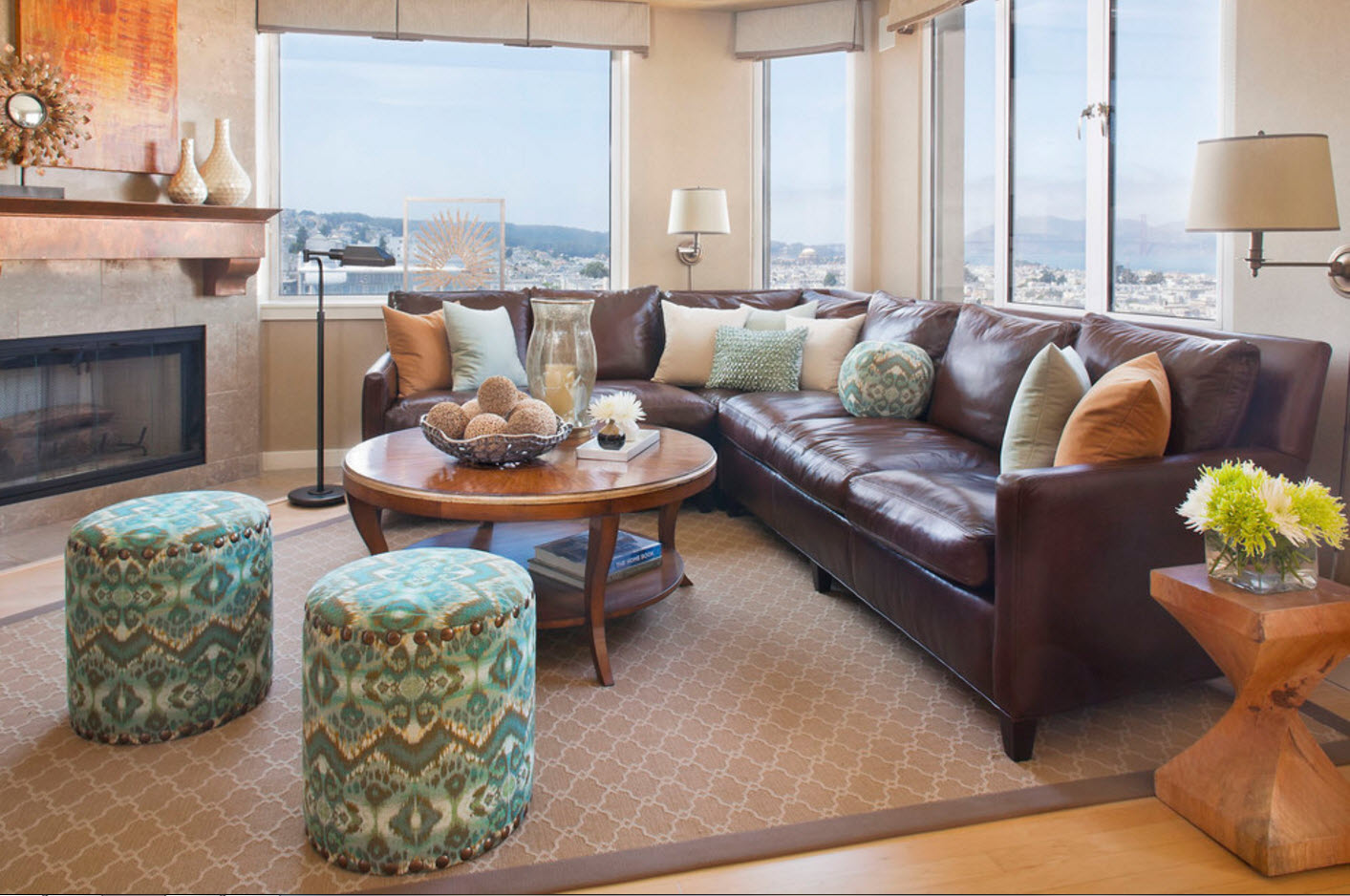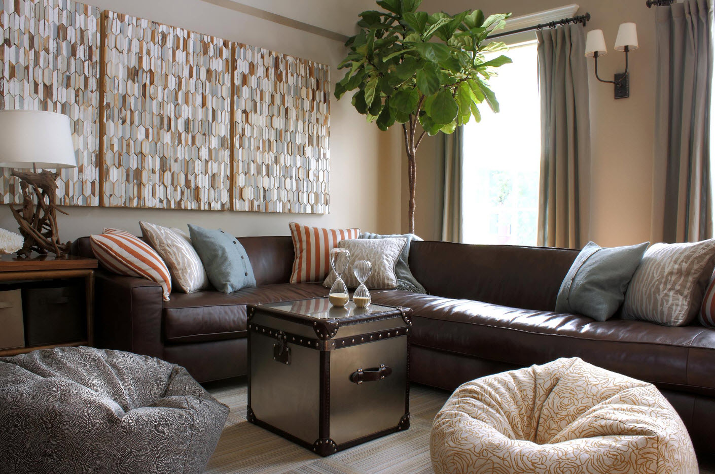 Практически все оттенки коричневого цвета – палитра для диванов с кожаной обивкой, которая не выходит из моды. Теплые природные оттенки – от светло-бежевого до цвета темного шоколада не только органично вписываются в интерьер помещения в светлых тонах, но и привносят столь необходимую небольшим пространствам теплоту. Такие кожаные диваны несложно сочетать с мягкой мебелью в других текстильных вариациях обивки. Учитывая, что кожаные диваны (если речь идет о натуральном материале обивки) служат дольше своих собратьев с текстильным оформлением, то именно под модель основного предмета интерьера будут подбираться дополнительные элементы.