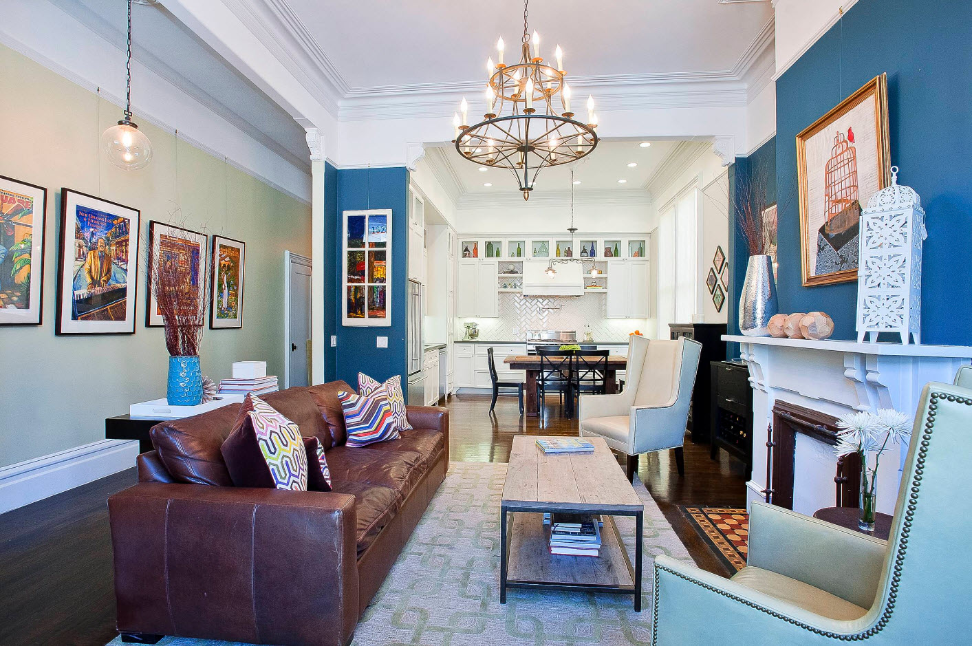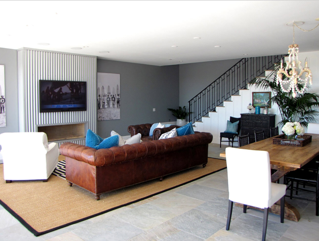 Если ваша гостиная делит пространство с кухней и столовой, то логично будет использовать кожаный диван в качестве предмета зонирования. Угловые модели отлично справляются с этой задачей, очерчивая условные границы зоны отдыха с двух сторон. Линейные модели справляются не хуже в комплекте с креслами, пуфами или оттоманками.