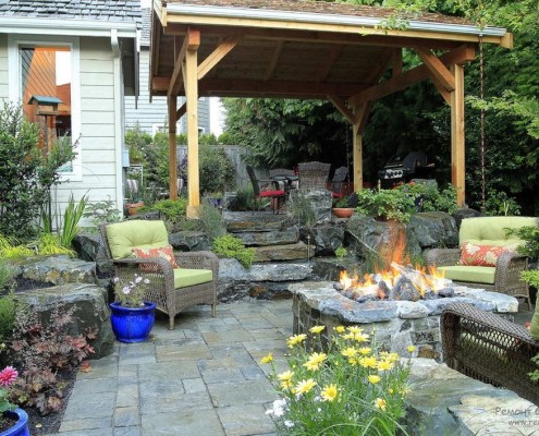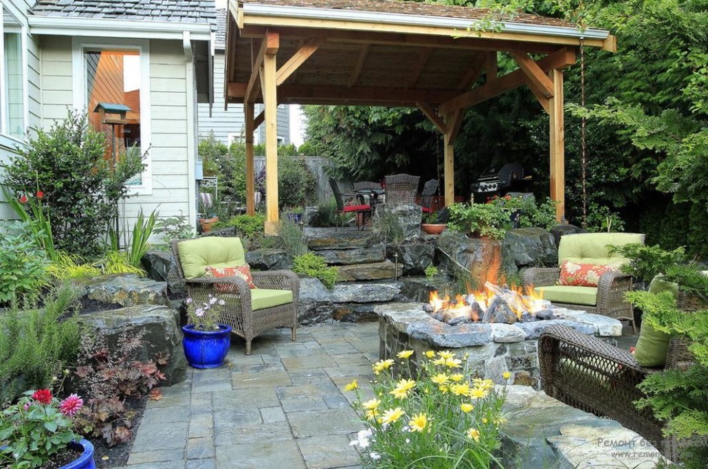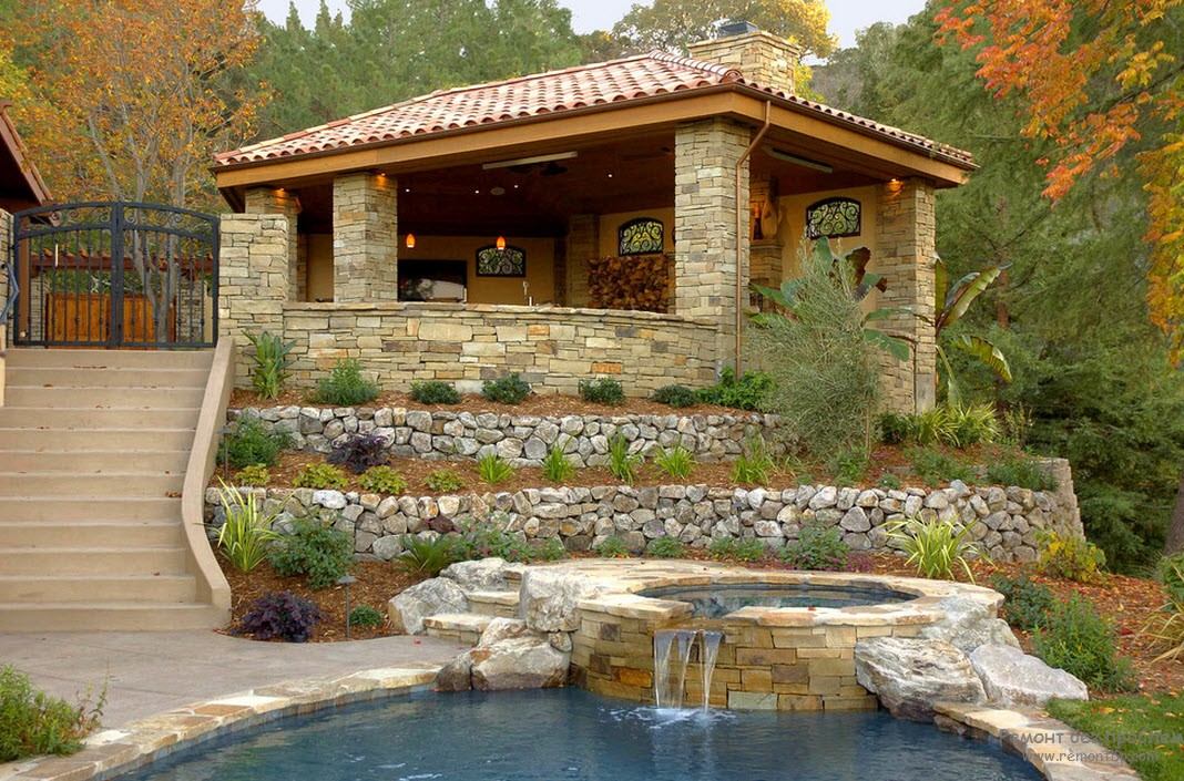 При создании каменной беседки-барбекю удачно использован наклонный рельеф,