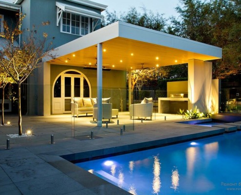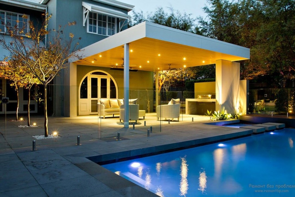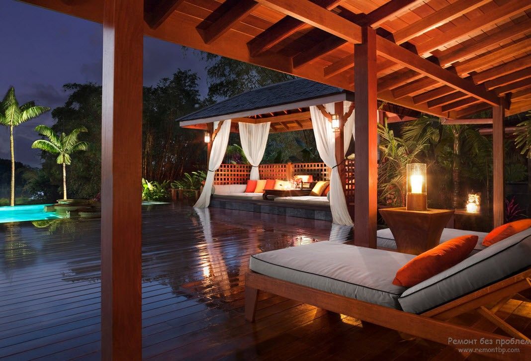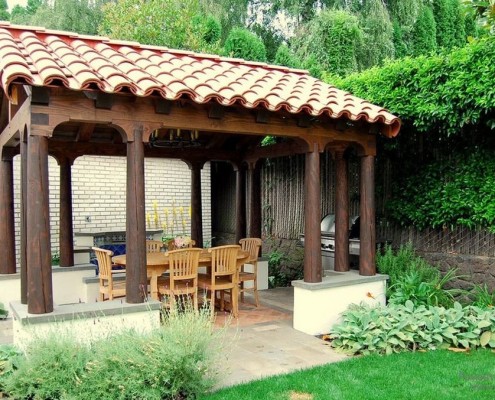 - В наших широтах популярны деревенский стиль (с соломенными или камышовыми крышами), рустик (грубые конструкции «топорной» работы), итальянский (обилие решёток, керамики и цветов – пергола, бельведер), а также современный стиль (или фьюжн, объединение стилей по воле фантазии и вкуса владельцев).