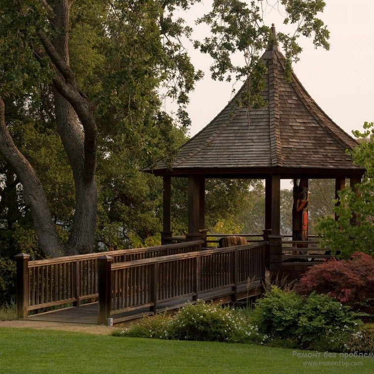 Деревянная многогранная беседка с крышей-шатром и ведущим к ней мостиком с высокими перилами